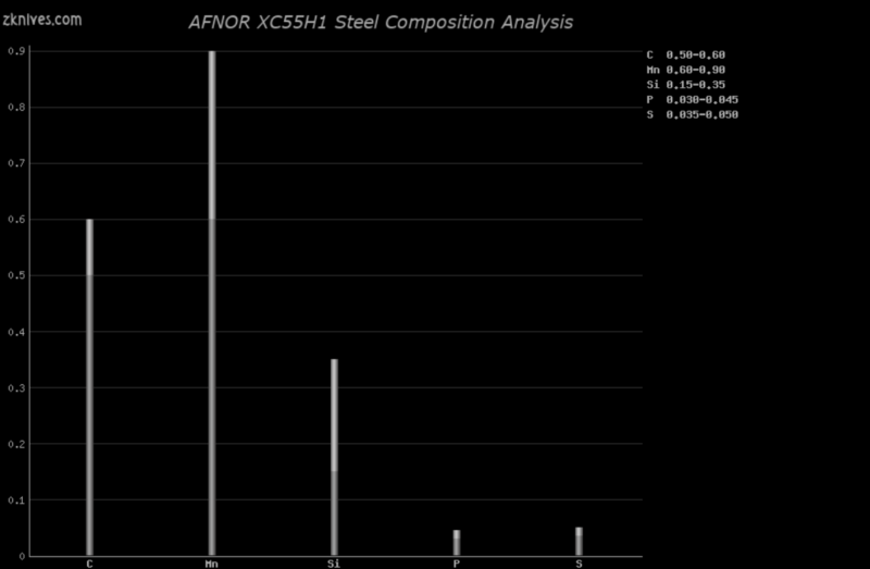 XC55H1(AFNOR) - 简单碳钢。耐磨性低,抗震性不错。适用于需要冲击强度的大型或投掷刀。