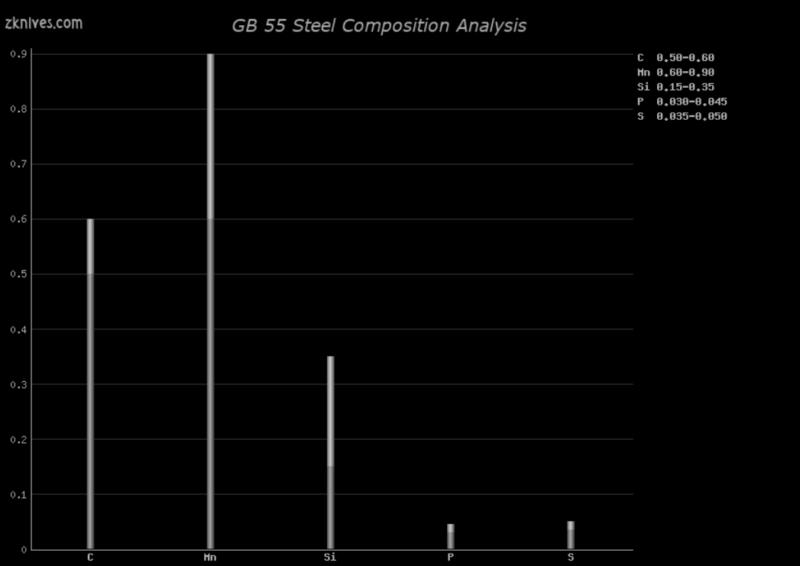 55(GB) - 简单碳钢。耐磨性低,抗震性不错。适用于需要冲击强度的大型或投掷刀。