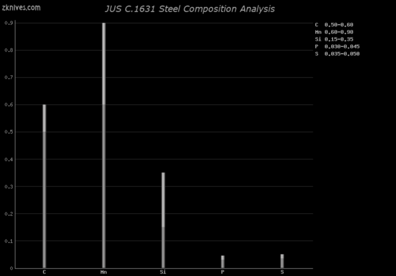 C.1631(JUS) - 简单碳钢。耐磨性低,抗震性不错。适用于需要冲击强度的大型或投掷刀。