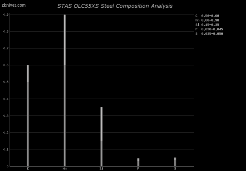 OLC55XS(STAS) - 简单碳钢。耐磨性低,抗震性不错。适用于需要冲击强度的大型或投掷刀。