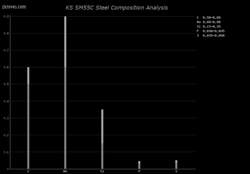 SM55C(KS) - 简单碳钢。耐磨性低,抗震性不错。适用于需要冲击强度的大型或投掷刀。
