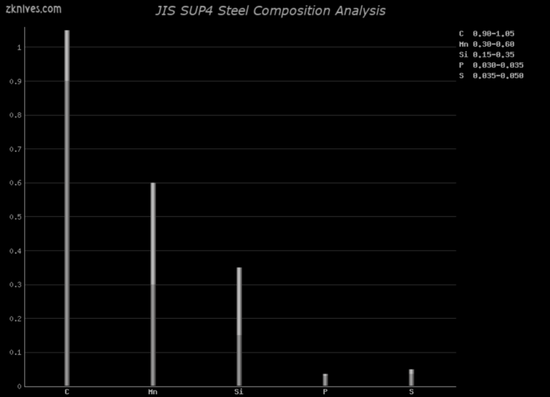 SUP4(JIS)- 简单但流行的碳刀片钢,由于易于加工,因此深受刀具制造商的欢迎。有点像事实上的标准碳钢,很容易生锈。典型的硬度在 58-60HRC 范围内。一些制造商将其一直提高到 64-65HRC。