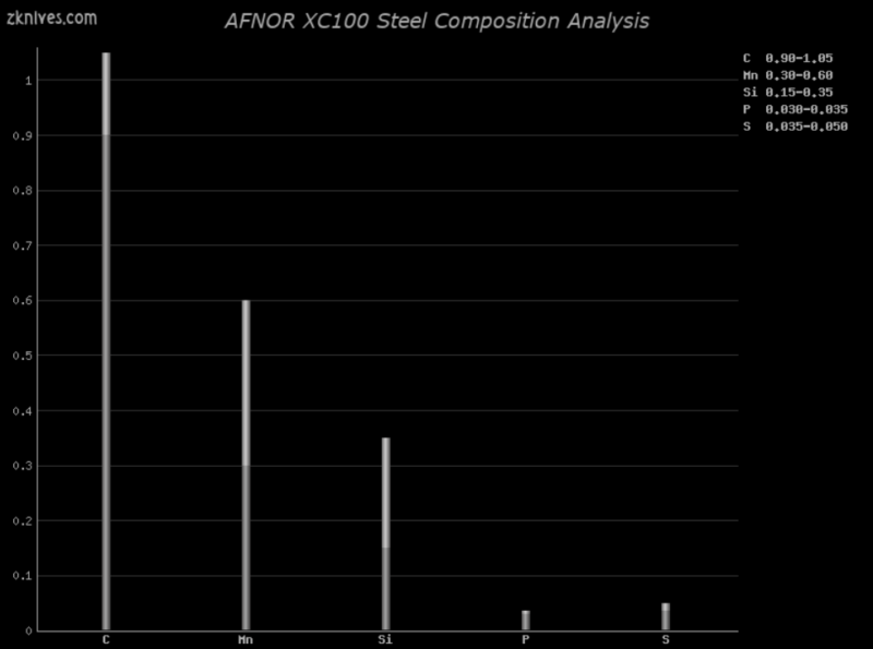 XC100(AFNOR) - 简单但流行的碳刀片钢,由于易于加工,因此深受刀具制造商的欢迎。有点像事实上的标准碳钢,很容易生锈。典型的硬度在 58-60HRC 范围内。一些制造商将其一直提高到 64-65HRC。