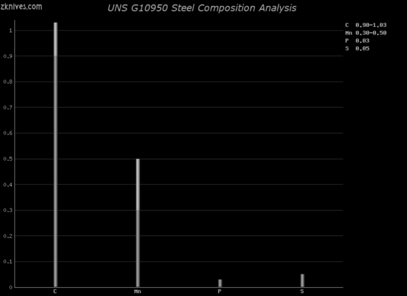 G10950(UNS) - 简单但流行的碳刀片钢,由于易于加工,因此深受刀具制造商的欢迎。有点像事实上的标准碳钢,很容易生锈。典型的硬度在 58-60HRC 范围内。一些制造商将其一直提高到 64-65HRC。 Sandvik以Sandvik 20C减振器的名义生产这种钢的非常纯净的等价物。主要缺点之一是耐磨性相对较低,因为这种合金中没有太多形成碳化物的物质。