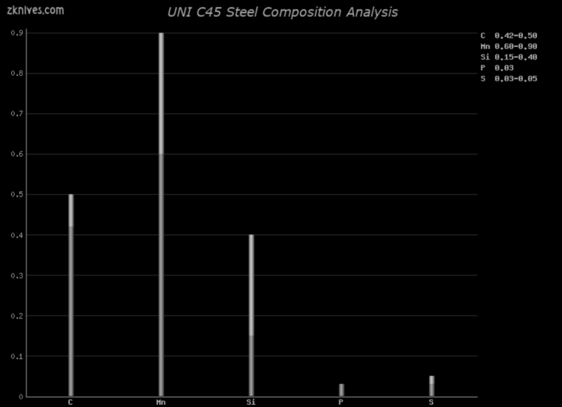 C45(UNI) - 我惊讶地发现 1045 实际上被用于刀具。AISI 10xx 系列的高碳版本更为普遍。好吧,当用于大型重型刀或飞刀时,它的性能仍然优于大多数廉价不锈钢刀片。