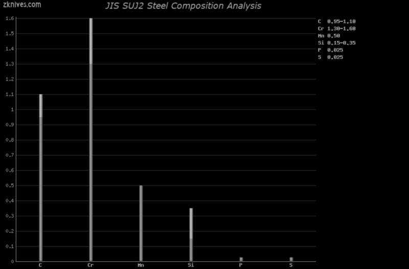 SUJ2(JIS) - 一种滚珠轴承钢,因此以前只供伪造者使用,现在有棒材可供选择。它与 5160 相似(尽管它的碳含量约为 1%,而 5160 ~.60%), 但更具有优势。它不如 5160 坚韧。它通常用于猎刀和其他刀具,用户愿意牺牲一点 5160 的韧性来换取 更好的耐磨性。然而,随着 52100 热处理的不断改进,这种钢开始出现在更大的刀具中并显示出优异的韧性。修改后的 SR-52100 名称下的 101 被 Jerry Busse 用于他的沼泽鼠刀。相当于德国的 1.3505 已停产。