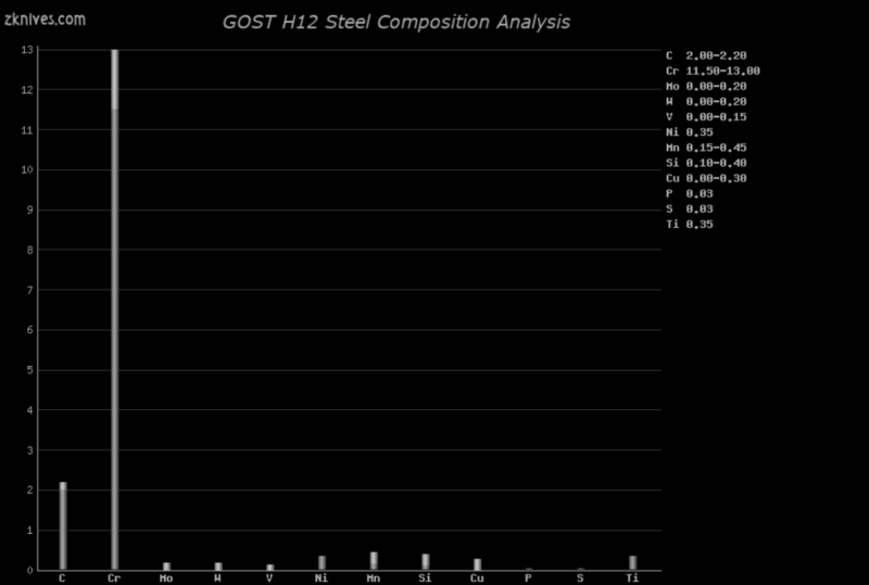 H12(GOST) - 相当于俄罗斯的 AISI D3 工具钢。与 D3 不同,它含有微量的钛。