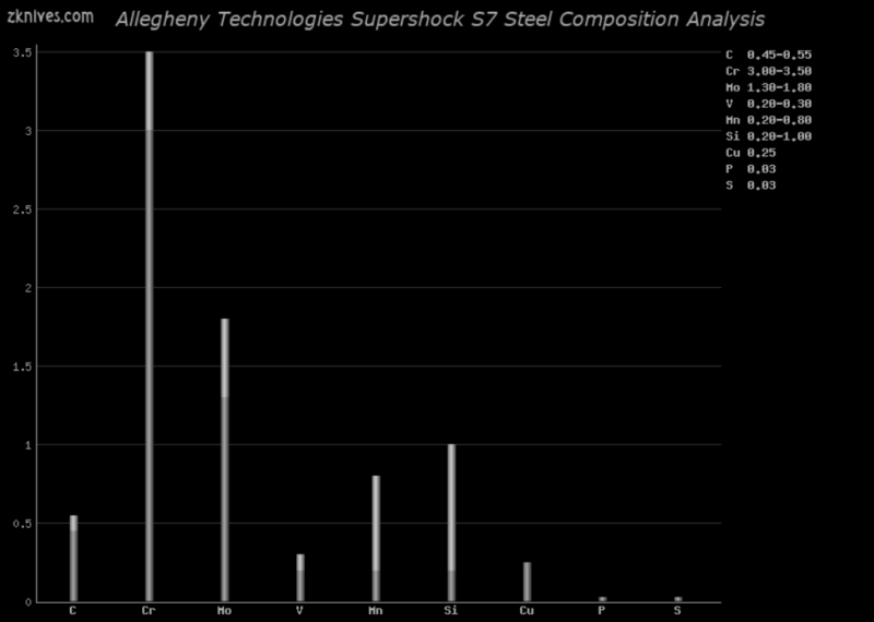 Supershock S7(Allegheny Technologies) - 高度抗震的工具钢。Busse SR-77 就是基于这种钢材。Crucible 生产自己的这种钢的纯净版本,称为 S7 XL 钢或 S7 Premium。