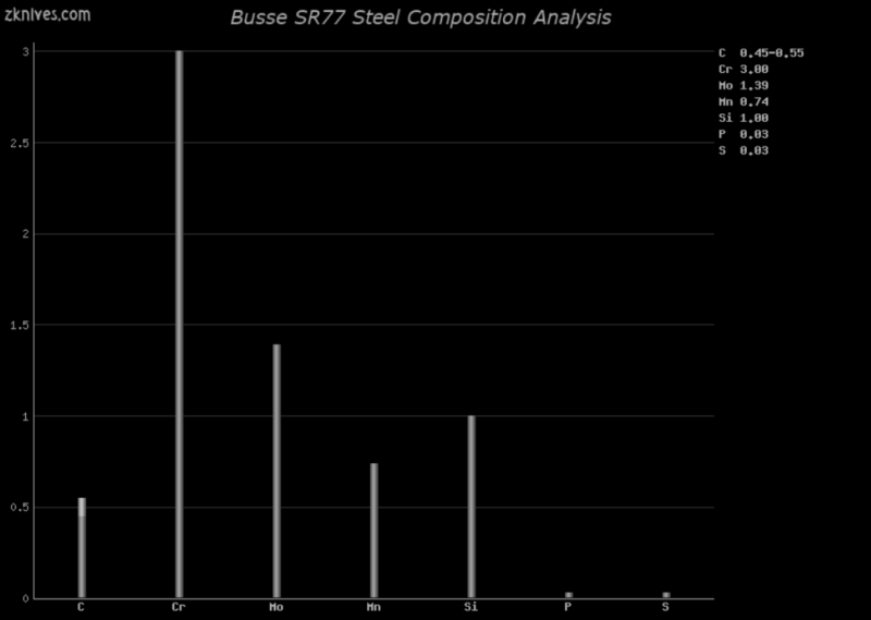 SR77(Busse) - Busse Combat knifes 由 AISI S7 抗震钢改装而成。成分分析由 Cobalt 在 BladeForums 上提交。性能报告非常积极,包括我自己的经验。
