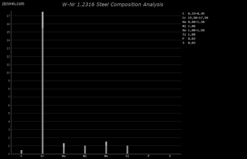 1.2316(W-Nr) - 中碳不锈钢,其中含有一些 Mo。用于廉价刀。
