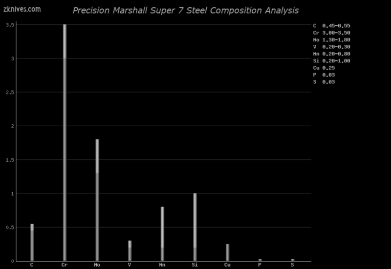 Super 7(Precision Marshall) - 高度抗震的工具钢。Busse SR-77 就是基于这种钢材。Crucible 生产自己的这种钢的清洁版本,称为 S7 XL 钢或 S7 Premium。
