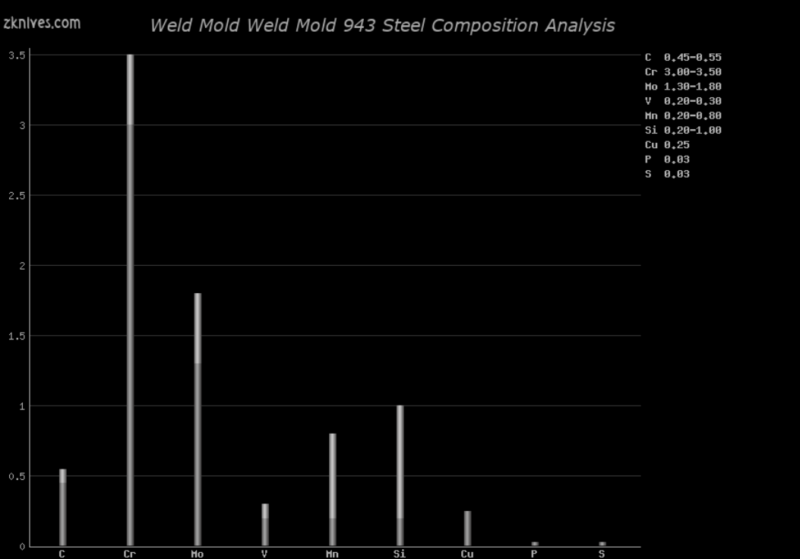 Weld Mold 943(焊接模具) - 高度抗震的工具钢。Busse SR-77 就是基于这种钢材。Crucible 生产自己的这种钢的清洁版本,称为 S7 XL 钢或 S7 Premium。