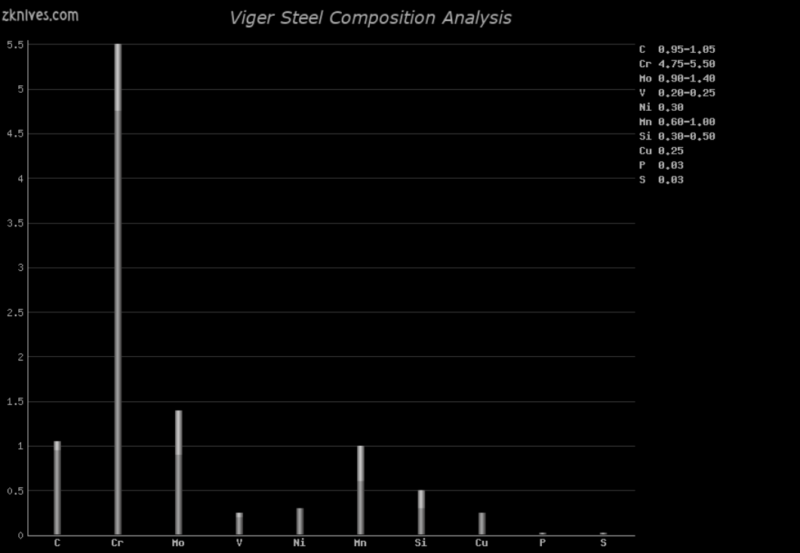 Viger(?) - 刀具钢常见问题解答 - 一种出色的空气硬化工具钢,它比 AISI D2 和 AISI M2 更坚韧,耐磨性更低。作为空气硬化钢,不要指望它会经过差别回火。它良好的韧性使其成为战斗刀的常见选择。