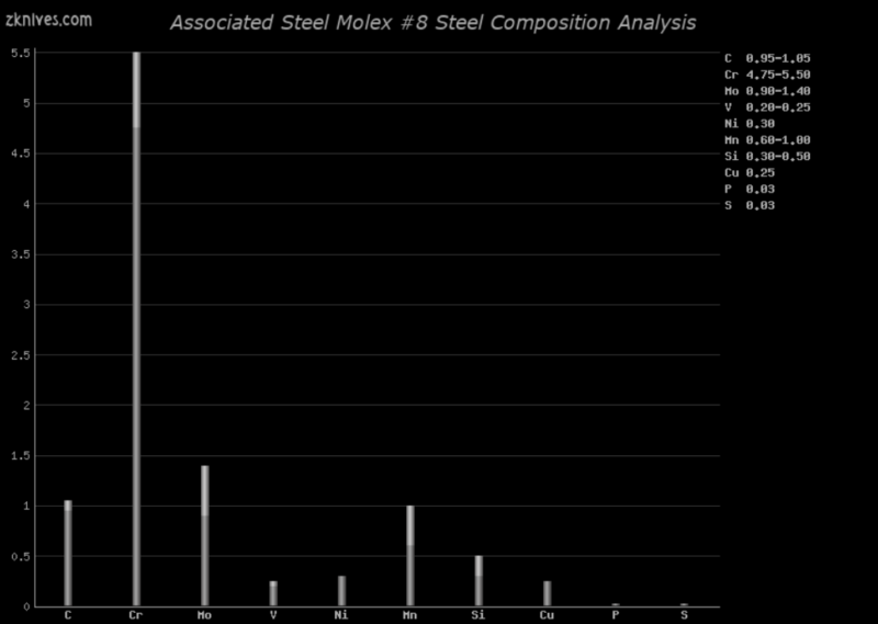 Molex #8(Associated Steel) - 刀具钢常见问题解答 - 一种出色的空气硬化工具钢,它比 AISI D2 和 AISI M2 更坚韧,耐磨性较差。作为空气硬化钢,不要指望它会经过差别回火。它良好的韧性使其成为战斗刀的常见选择。