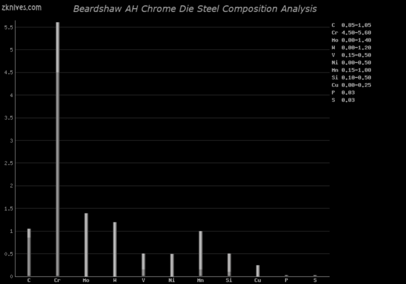 AH Chrome Die(Beardshaw) - 刀具钢常见问题解答 - 一种出色的空气硬化工具钢,它比 AISI D2 和 AISI M2 更坚韧,耐磨性更低。作为空气硬化钢,不要指望它会经过差别回火。它良好的韧性使其成为战斗刀的常见选择。