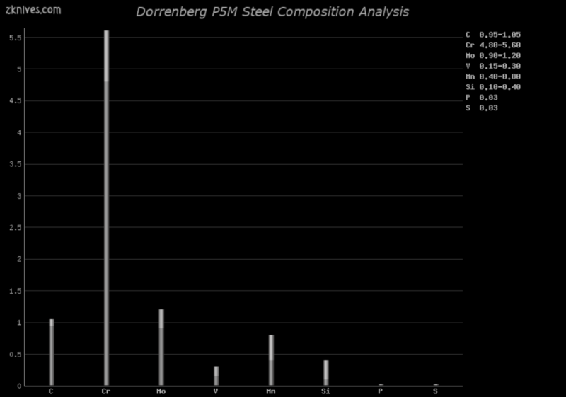 P5M(Dorrenberg) - 刀具钢常见问题 - 一种出色的空气硬化工具钢,比 AISI D2 和 AISI M2 更坚韧,耐磨性更低。作为空气硬化钢,不要指望它会经过差别回火。它良好的韧性使其成为战斗刀的常见选择。