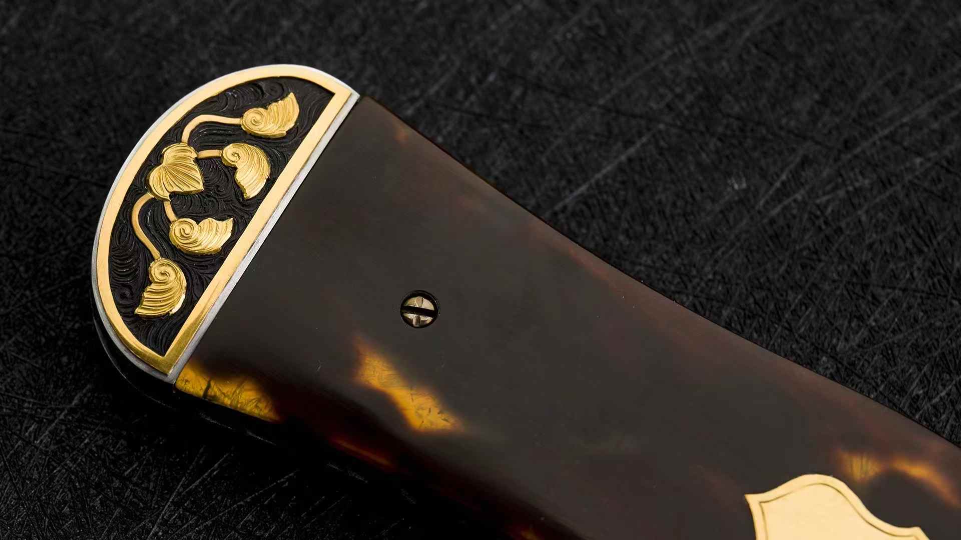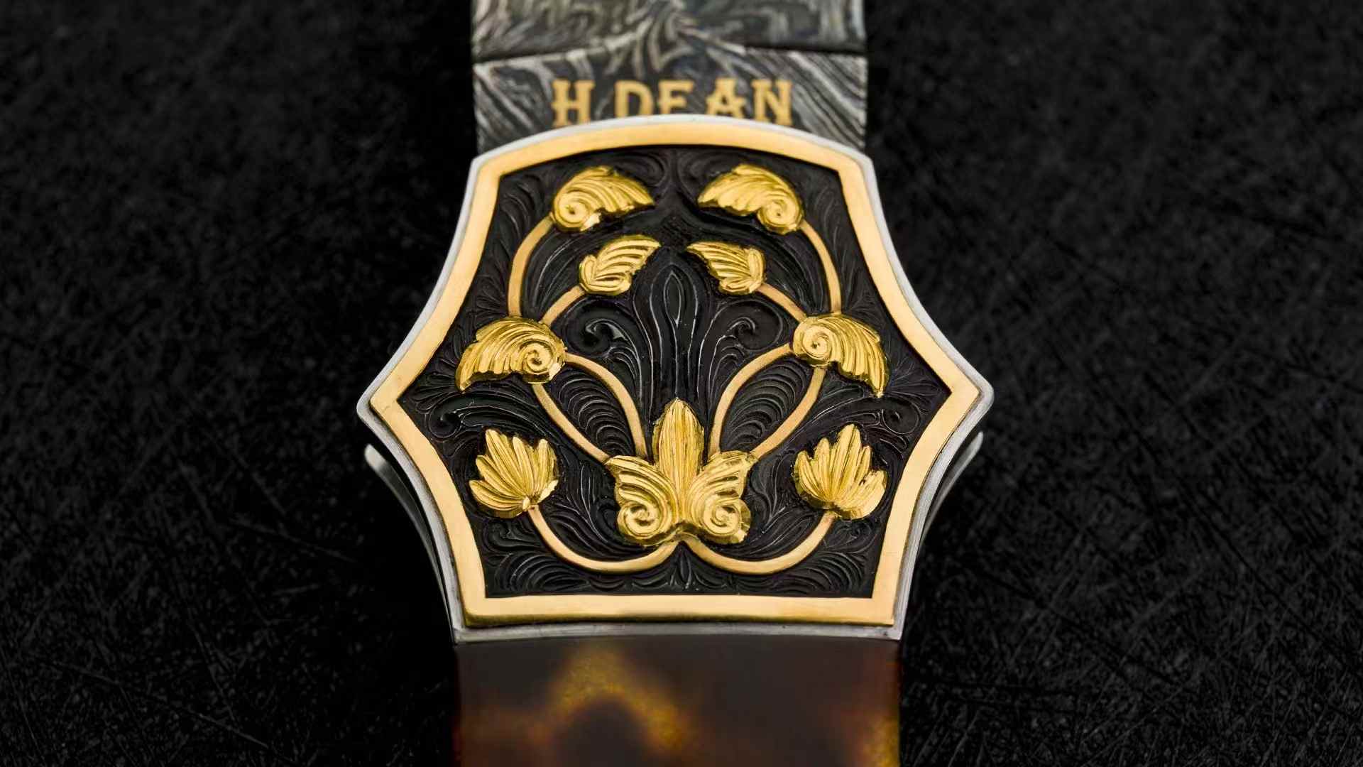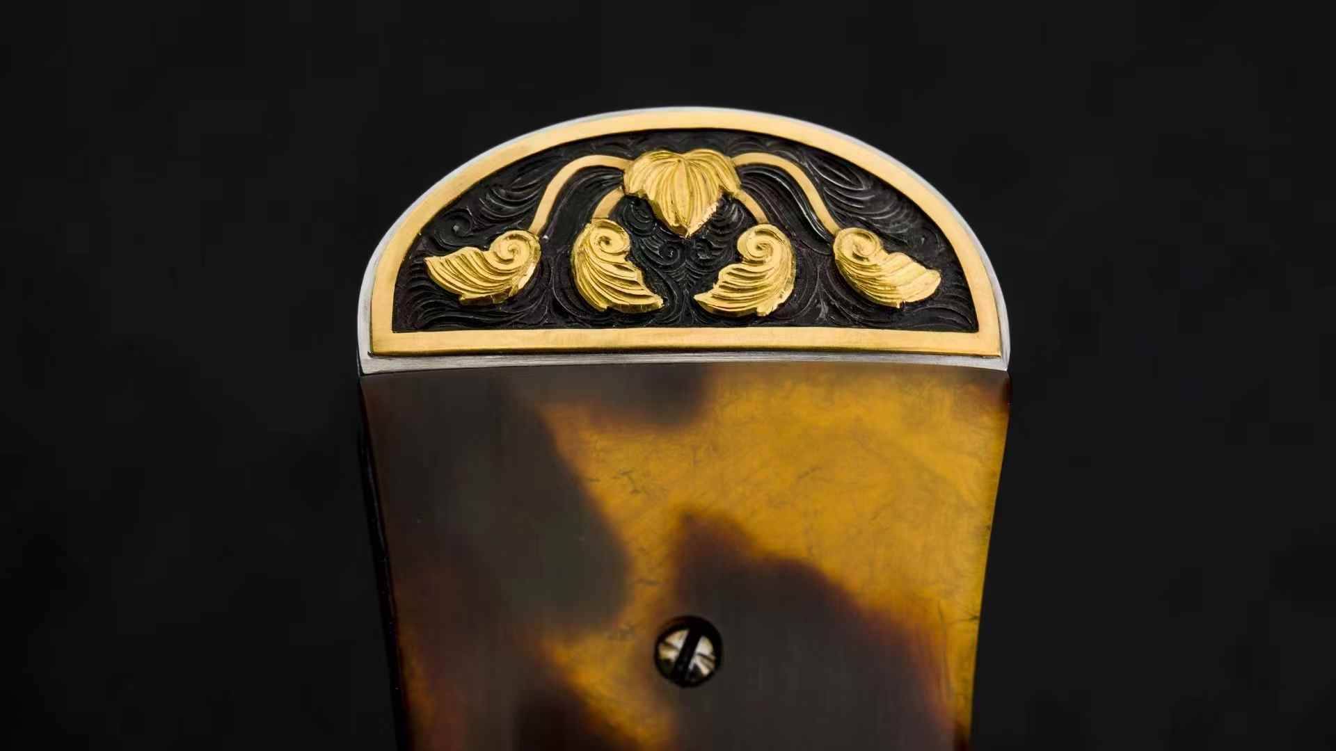 刀柄采用416不锈钢以及古董名贵材料制作而成,刀柄中心镶嵌黄金制成的盾形纹章,可以雕刻主人的姓名。刀柄两侧不锈钢区域,哈维展现了他精美的雕工,在2021年拜师美国雕刻大师巴瑞李之后,哈维掌握了其招牌的黄金浮雕卷叶高浮雕技法。在这件作品中,24K纯金浮雕黄金卷叶得到了充分的展现,配合哑光黑浮雕卷叶的背景,立体感塑造得极为出色,满满的金秋之叶映入眼帘,谱写出这首美妙的秋之旋律。
