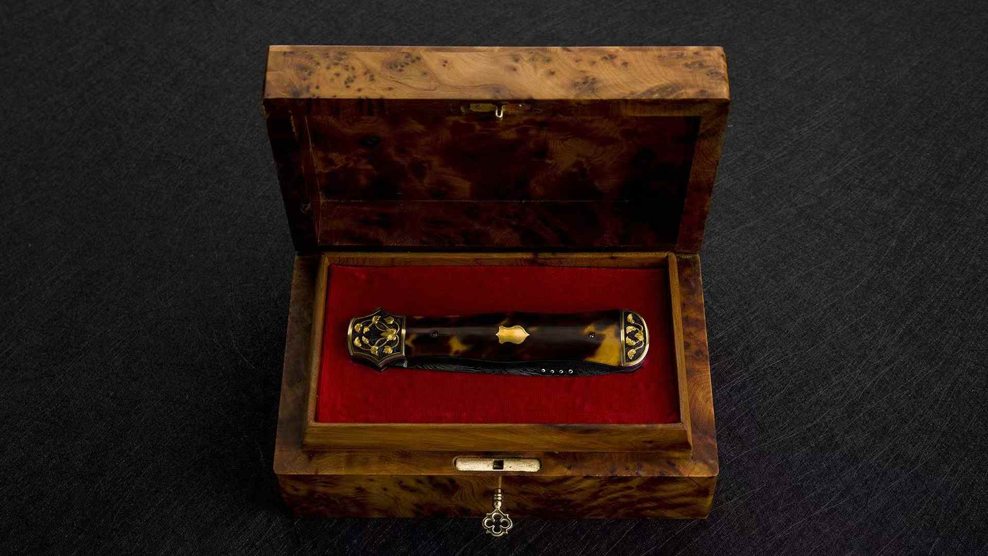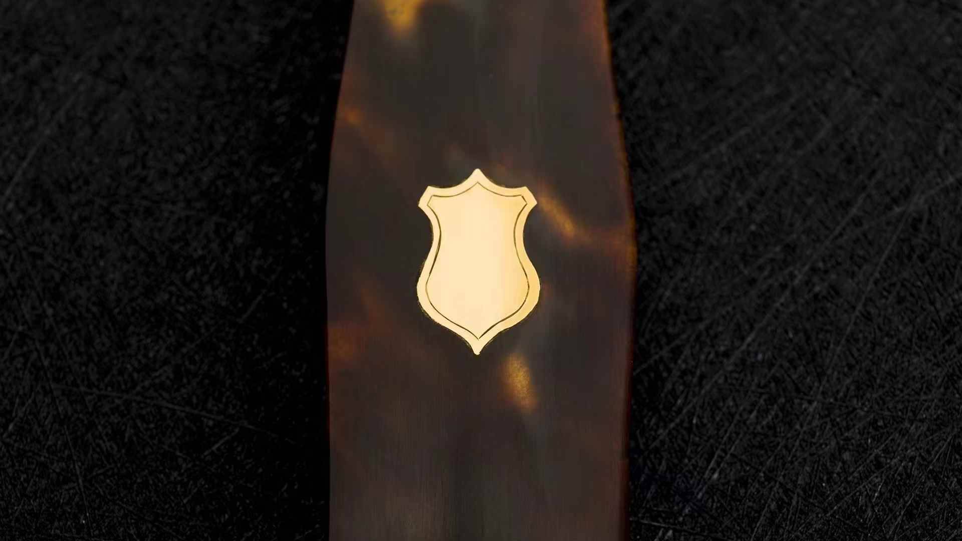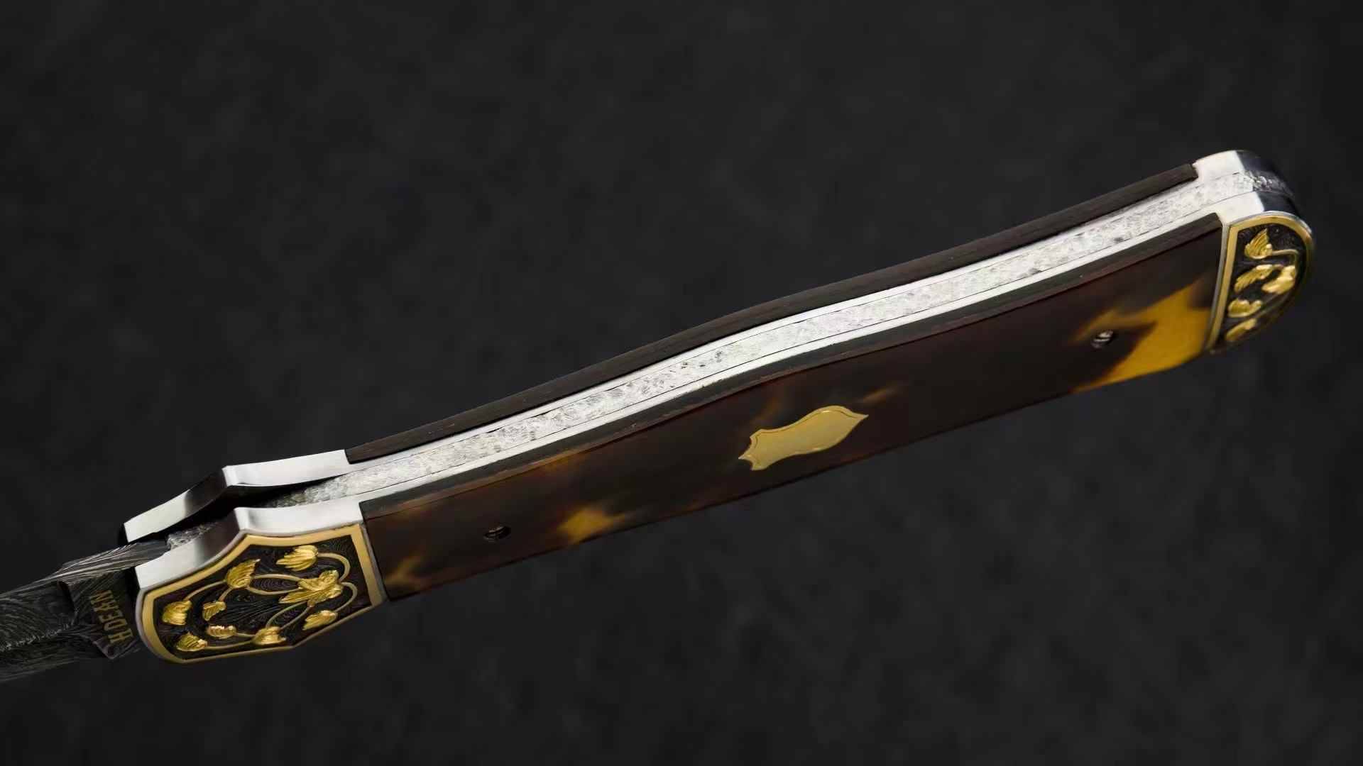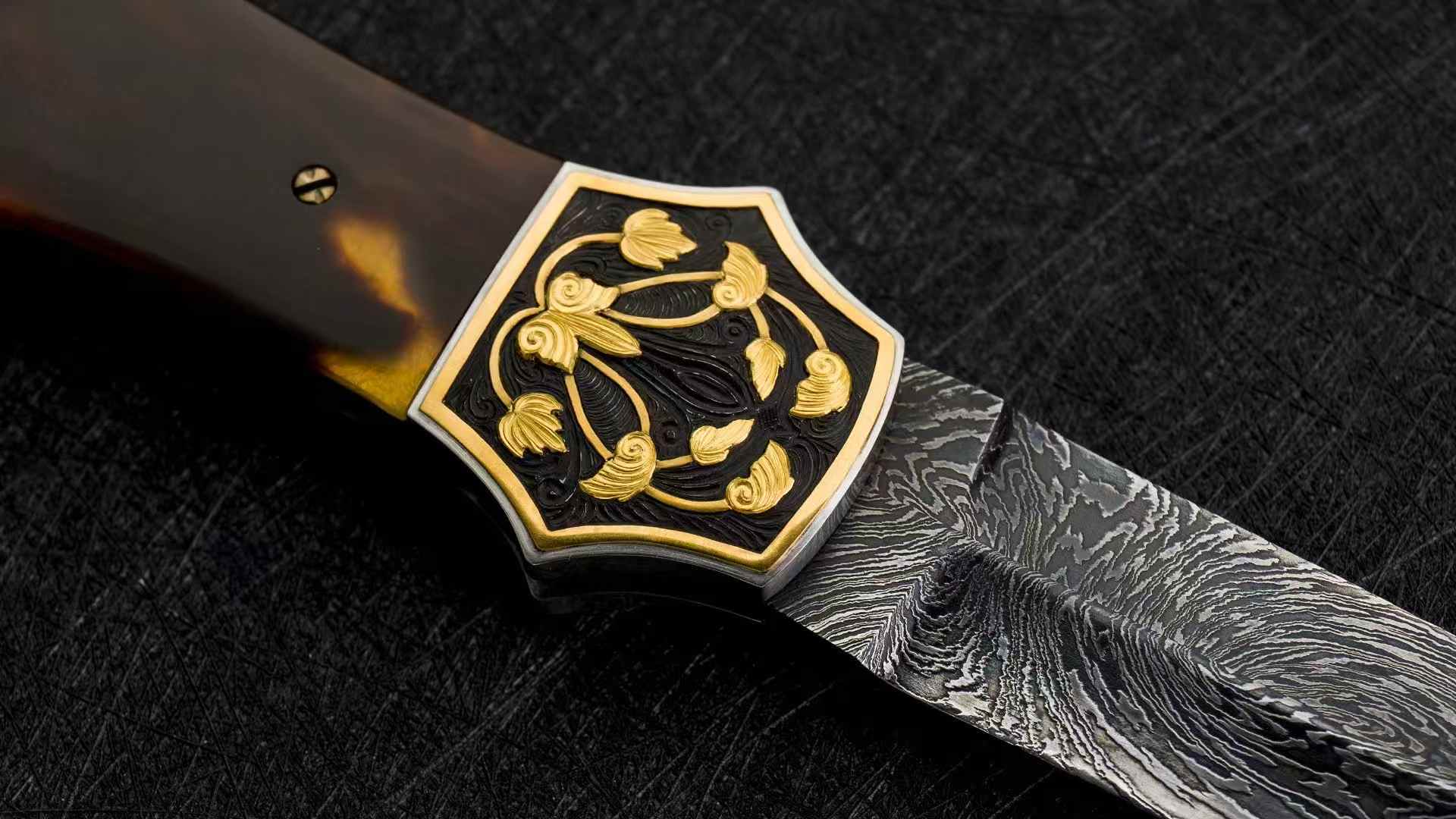 刀柄采用416不锈钢以及古董名贵材料制作而成,刀柄中心镶嵌黄金制成的盾形纹章,可以雕刻主人的姓名。刀柄两侧不锈钢区域,哈维展现了他精美的雕工,在2021年拜师美国雕刻大师巴瑞李之后,哈维掌握了其招牌的黄金浮雕卷叶高浮雕技法。在这件作品中,24K纯金浮雕黄金卷叶得到了充分的展现,配合哑光黑浮雕卷叶的背景,立体感塑造得极为出色,满满的金秋之叶映入眼帘,谱写出这首美妙的秋之旋律。