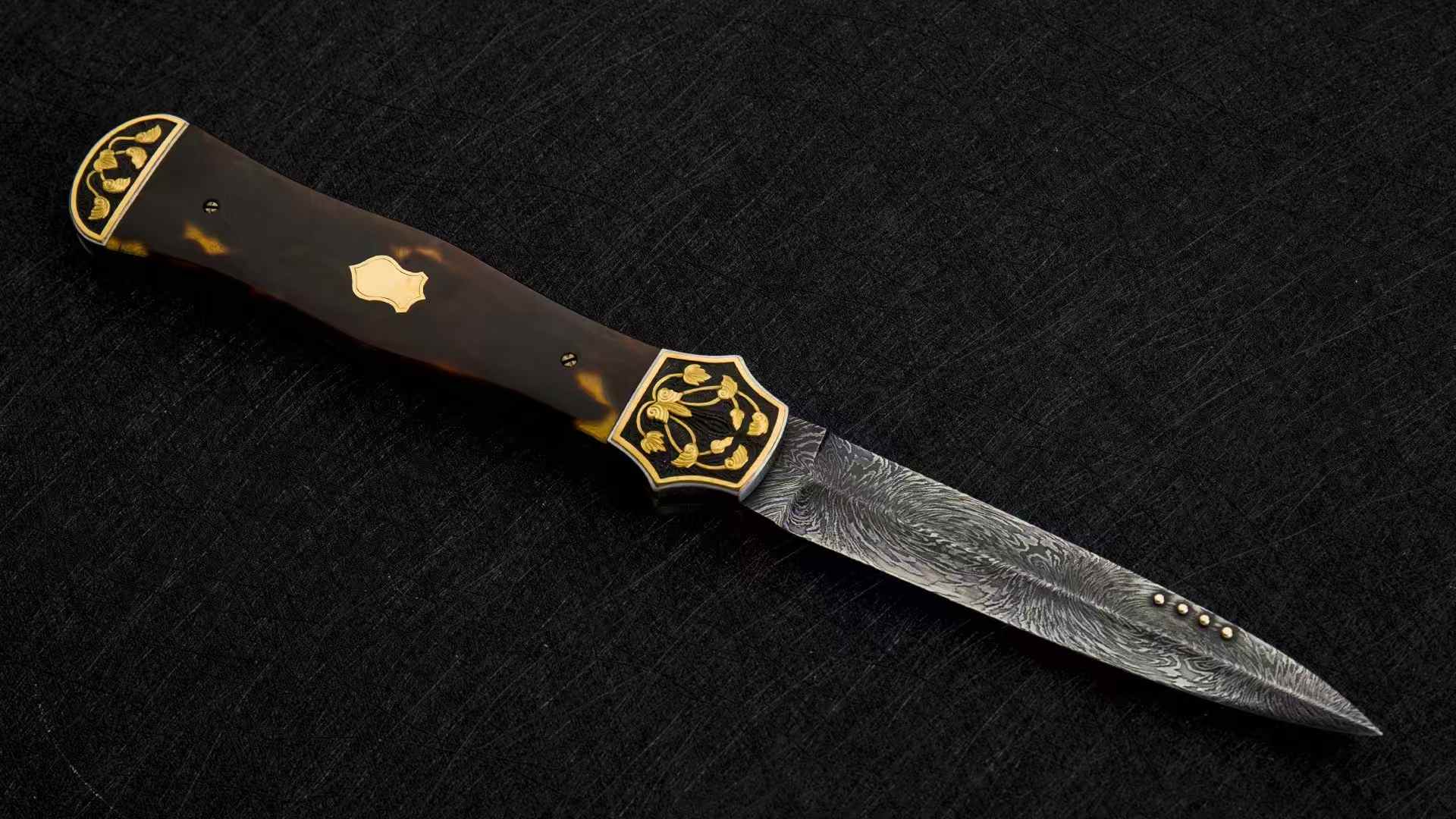 AKI 2022展品,AKI,ABS MS前任主席哈维.迪恩手工打造,孤品唯一,为哈维制作的最大尺寸的口袋刀机构剑型折刀!哈维制刀数十年,作为ABS曾今的主席孕育了一批批优秀的新人,其本人也在海外展会多次获得业内大奖,同时哈维还精通雕刻,技术全面,是一位德高望重的锻造艺术家。此件作品全长25厘米,刃长10.5厘米,裸重158克。刀刃采用哈维锻造大马士革制成,灵动优美的花纹如同秋风的律动,极具诗情画意。刀刃采用18K黄金铆钉制作开刀钮,刀刃在展开90度时会停止一次,这是经典的90度STOP口袋刀结构设计。