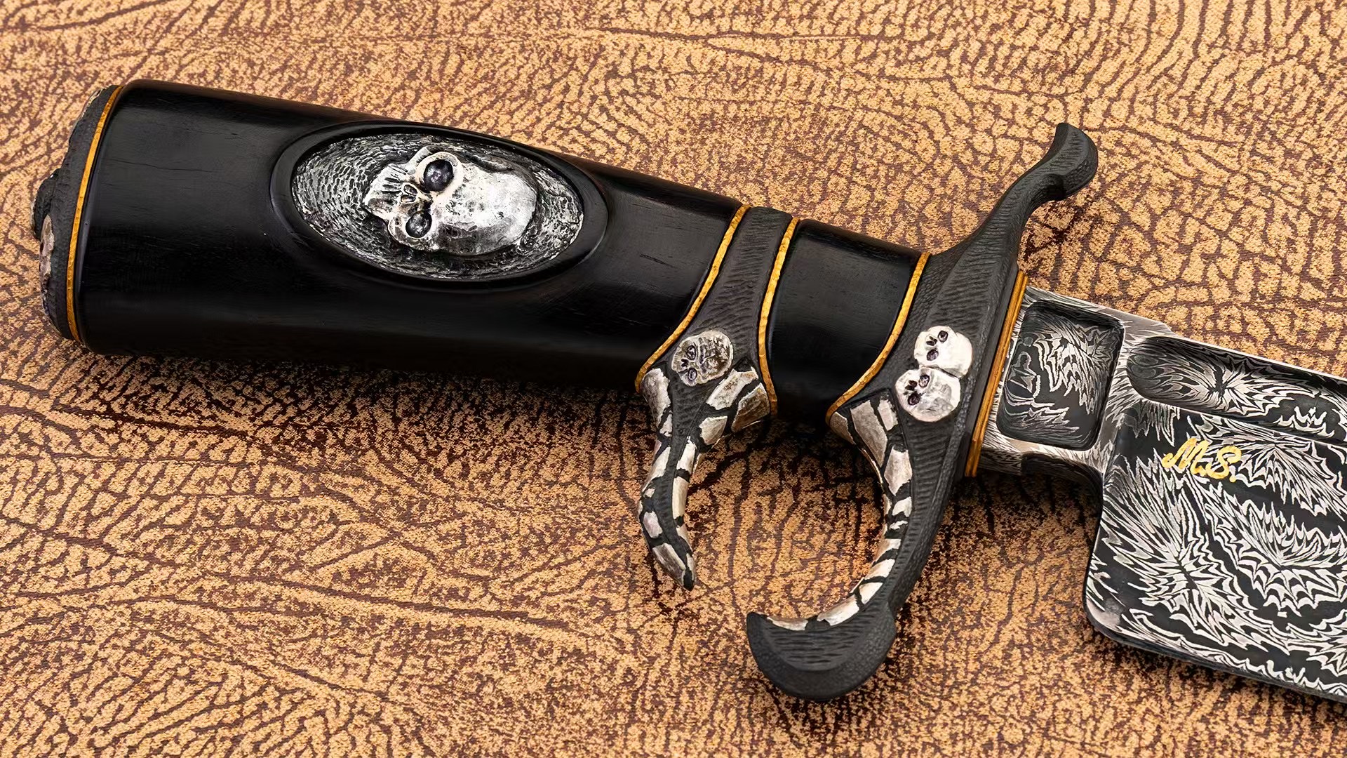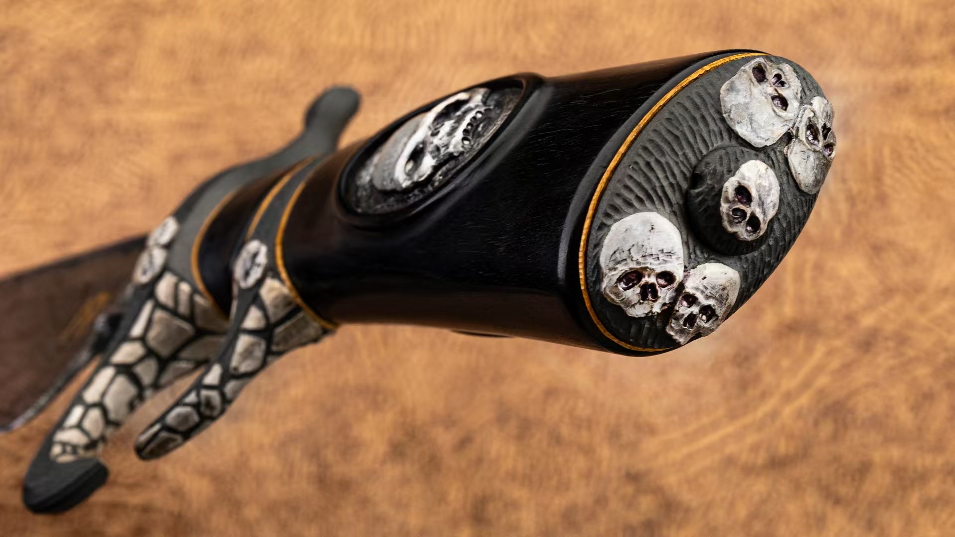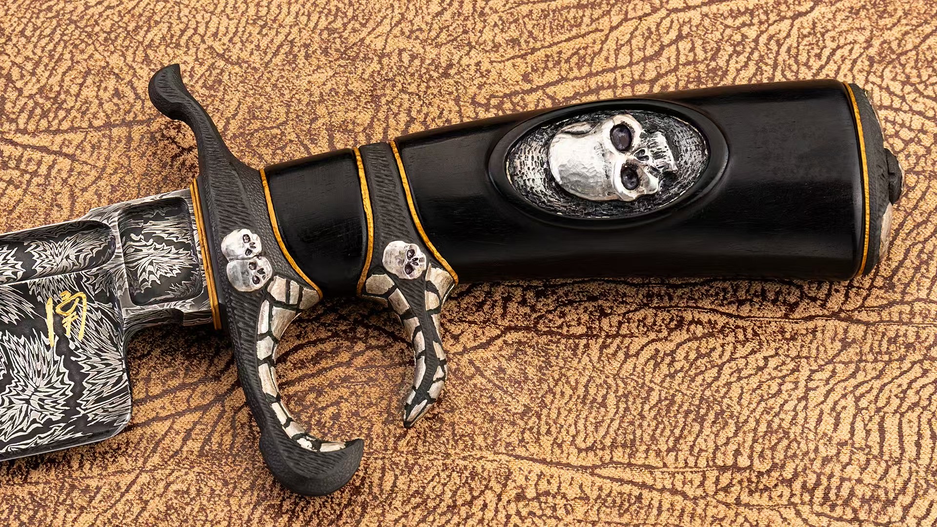 大马士革花纹是由变体繁花纹组成的有序图案,这种图案巧妙地描绘了大墓穴中由遗骨墙分割出来的小径。刀柄采用非洲黑木制成,无疑黑色是最符合主题的颜色,纯银雕刻的强烈花纹以及骷髅构成了墓穴中最常见的风景;刀柄镶嵌了黄金进行提色,黄金同时在这里也寓意着地下墓穴中部分遗骨生前也拥有着辉煌的人生,不过死亡面前人人平等,终究化作一具骸骨。刀鞘同样制作精良,完美匹配这件接触钢铁艺术品。