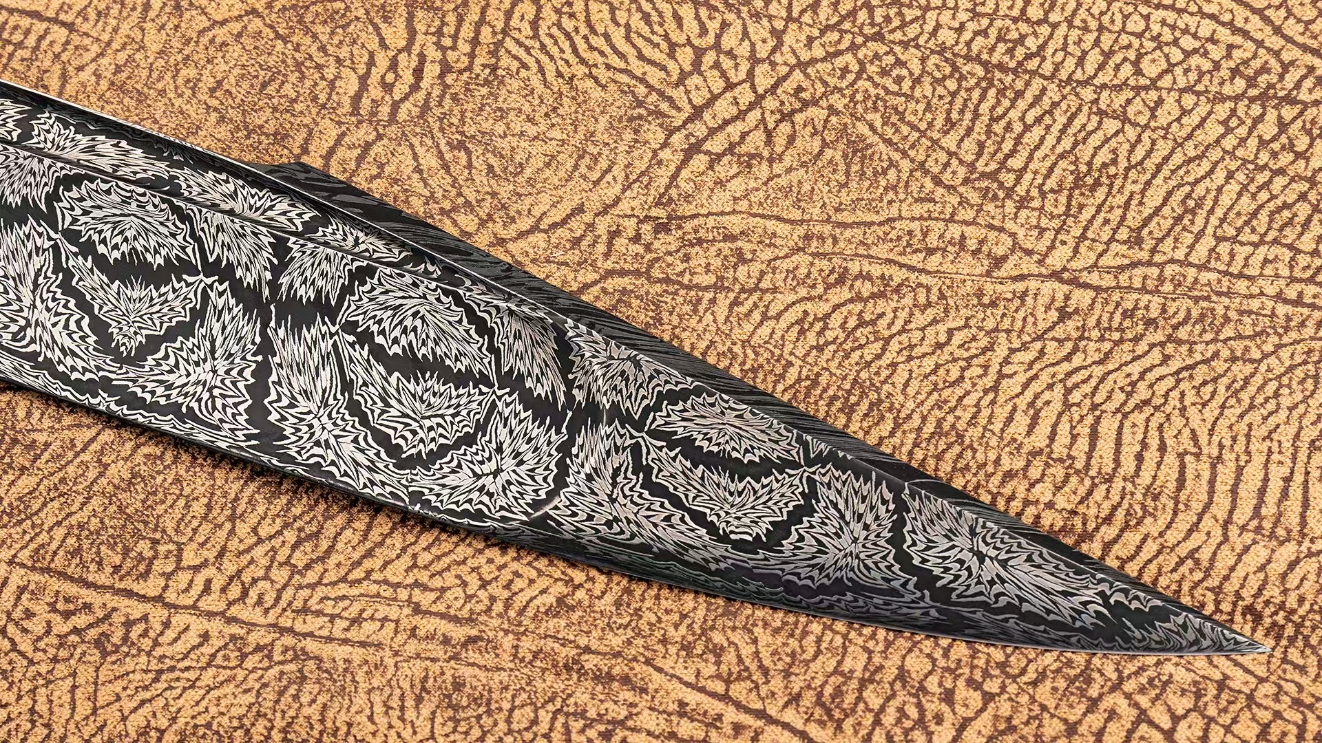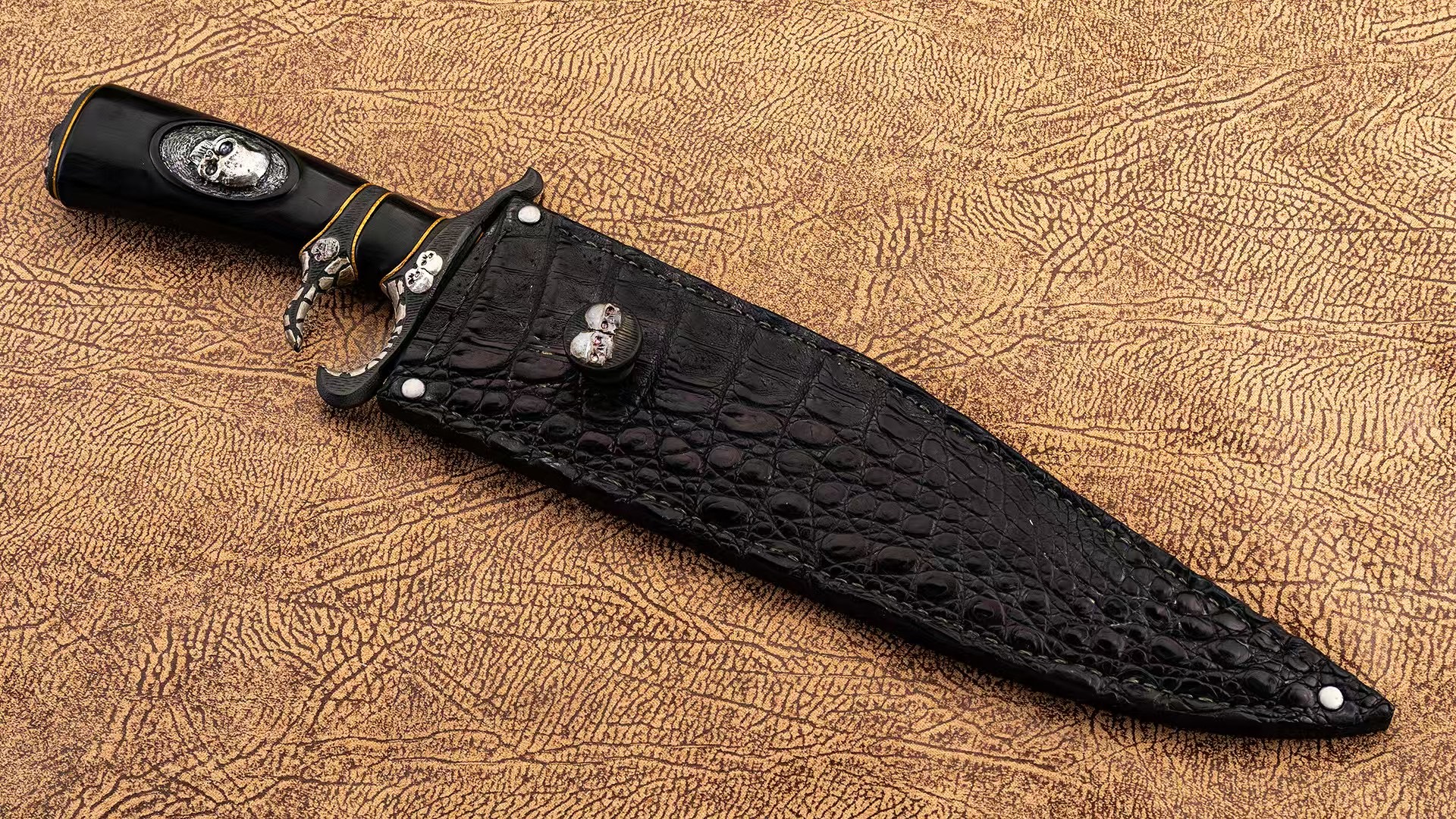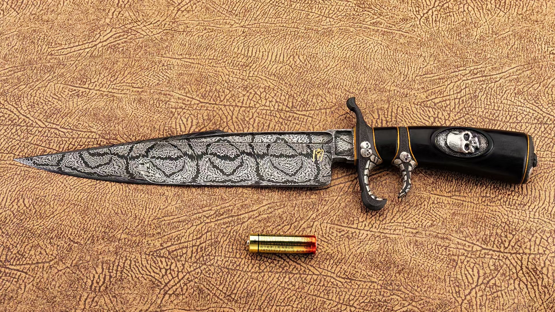大马士革花纹是由变体繁花纹组成的有序图案,这种图案巧妙地描绘了大墓穴中由遗骨墙分割出来的小径。刀柄采用非洲黑木制成,无疑黑色是最符合主题的颜色,纯银雕刻的强烈花纹以及骷髅构成了墓穴中最常见的风景;刀柄镶嵌了黄金进行提色,黄金同时在这里也寓意着地下墓穴中部分遗骨生前也拥有着辉煌的人生,不过死亡面前人人平等,终究化作一具骸骨。刀鞘同样制作精良,完美匹配这件接触钢铁艺术品。