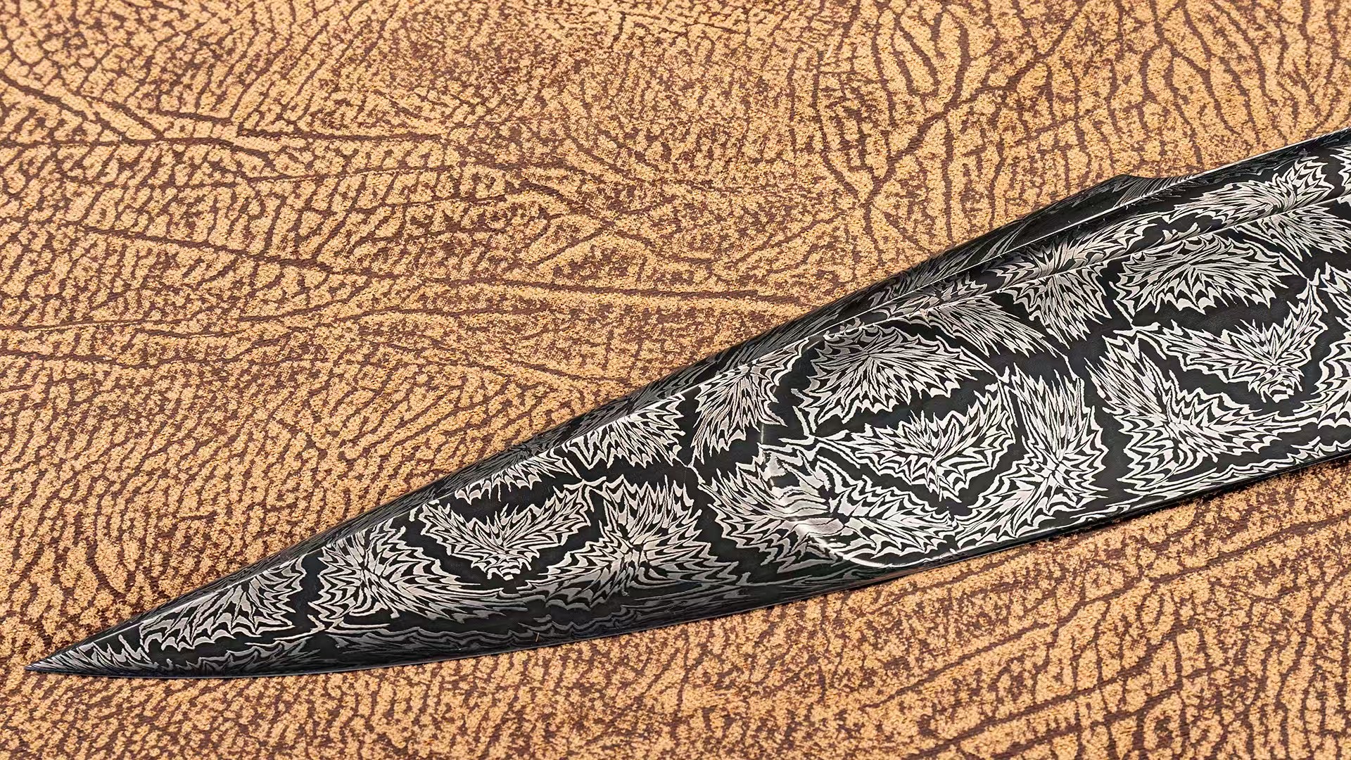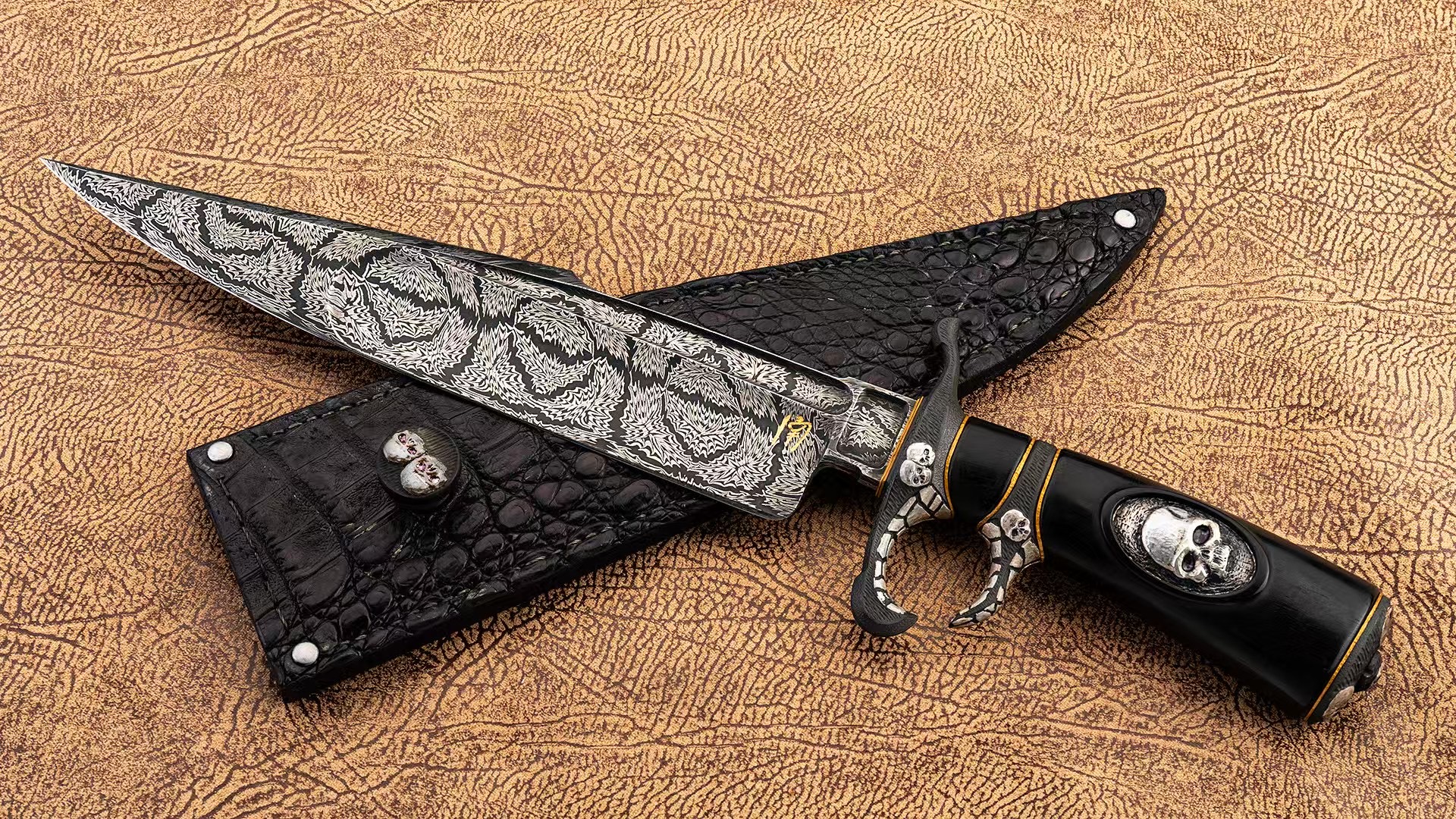 安德鲁于2021年成为AKI最年轻的成员之一。骷髅墓全长40厘米,刃长25厘米,裸重520克,鞘重150克。站在AKI等级作品的角度,整件作品从外形到大马士革花纹再到选材和雕刻都围绕地下墓穴这一主题。首先整件作品为凶狠的双护手战斗刀款式,战斗刀象征着死亡也象征着勇气,这里选择战斗刀款就是对死亡表达的一种敬畏,更深层次艺术家希望能展现一种平静,就像你穿越几百万人遗骨的小径除了勇气,更重要的是一颗平静内心。