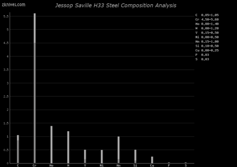 H33(Jessop Saville) - 刀具钢常见问题解答 - 一种出色的空气硬化工具钢,它比 AISI D2 和 AISI M2 更坚韧,耐磨性更低。作为空气硬化钢,不要指望它会经过差别回火。它良好的韧性使其成为战斗刀的常见选择。