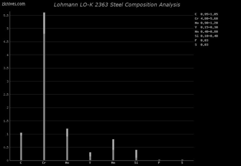 LO-K 2363(Lohmann) - 刀具钢常见问题解答 - 一种出色的空气硬化工具钢,比 AISI D2 和 AISI M2 更坚韧,耐磨性较低。作为空气硬化钢,不要指望它会经过差别回火。它良好的韧性使其成为战斗刀的常见选择。