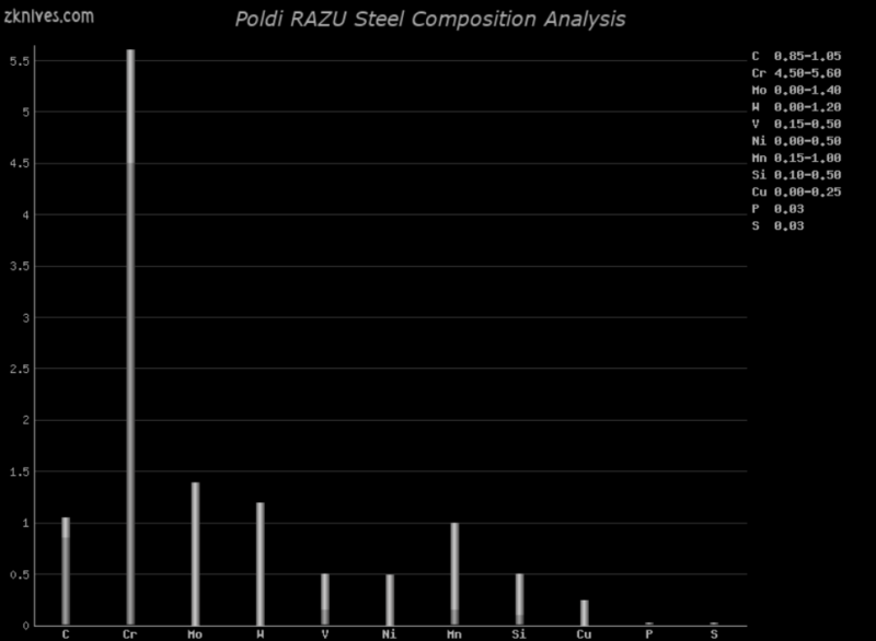 RAZU(Poldi) - 刀具钢常见问题 - 一种出色的空气硬化工具钢,它比 AISI D2 和 AISI M2 更坚韧,耐磨性更低。作为空气硬化钢,不要指望它会经过差别回火。它良好的韧性使其成为战斗刀的常见选择。