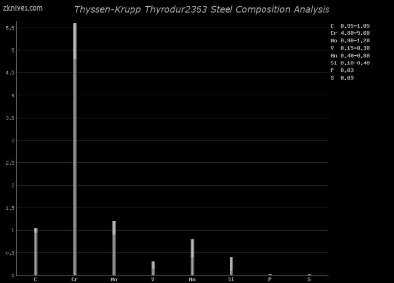 Thyrodur2363(Thyssen-Krupp) - 刀具钢常见问题解答 - 一种出色的空气硬化工具钢,比 AISI D2 和 AISI M2 更坚韧,耐磨性更低。作为空气硬化钢,不要指望它会经过差别回火。它良好的韧性使其成为战斗刀的常见选择。