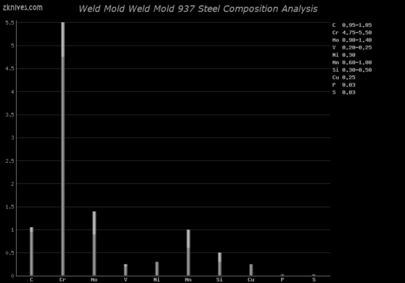 Weld Mold 937(焊接模具) - 刀具钢常见问题 - 一种出色的空气硬化工具钢,它比 AISI D2 和 AISI M2 更坚韧,耐磨性更低。作为空气硬化钢,不要指望它会经过差别回火。它良好的韧性使其成为战斗刀的常见选择。
