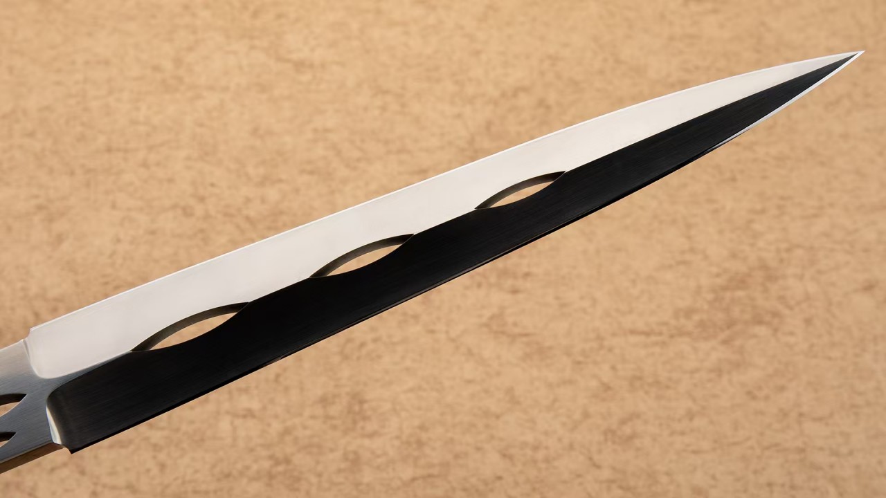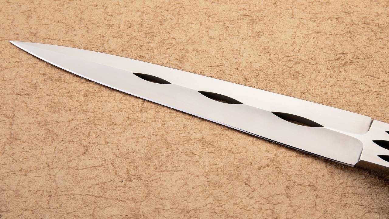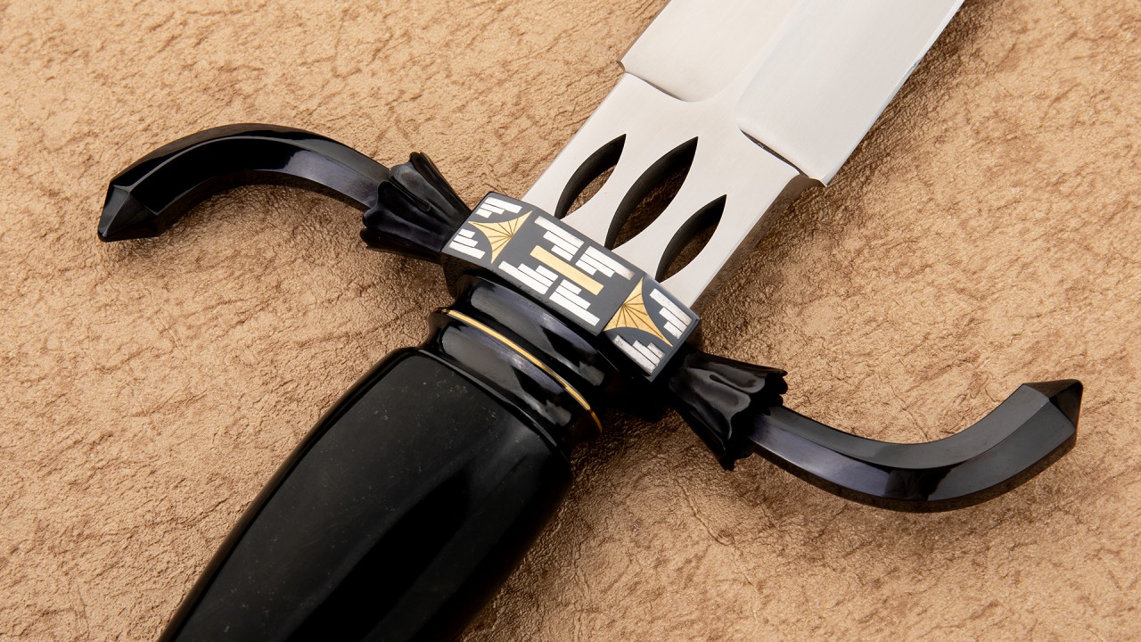 全长16.3厘米,刃长6.5厘米,裸重65克,刀刃采用ATS34不锈钢制作而成,手工缎面拉丝处理刃面,笔直细腻。刀柄采用416不锈钢制作而成,刀柄每侧制作了6块镂空,外形复杂,边缘过渡极为精准,展现了史蒂夫精湛无比的细节操作能力。镂空区域镶嵌了深海黑贝母,贝母色彩深邃梦幻,在光线下欣赏极富变幻,如同极地夜空散发的淡淡极光,极富诗情画意之美。