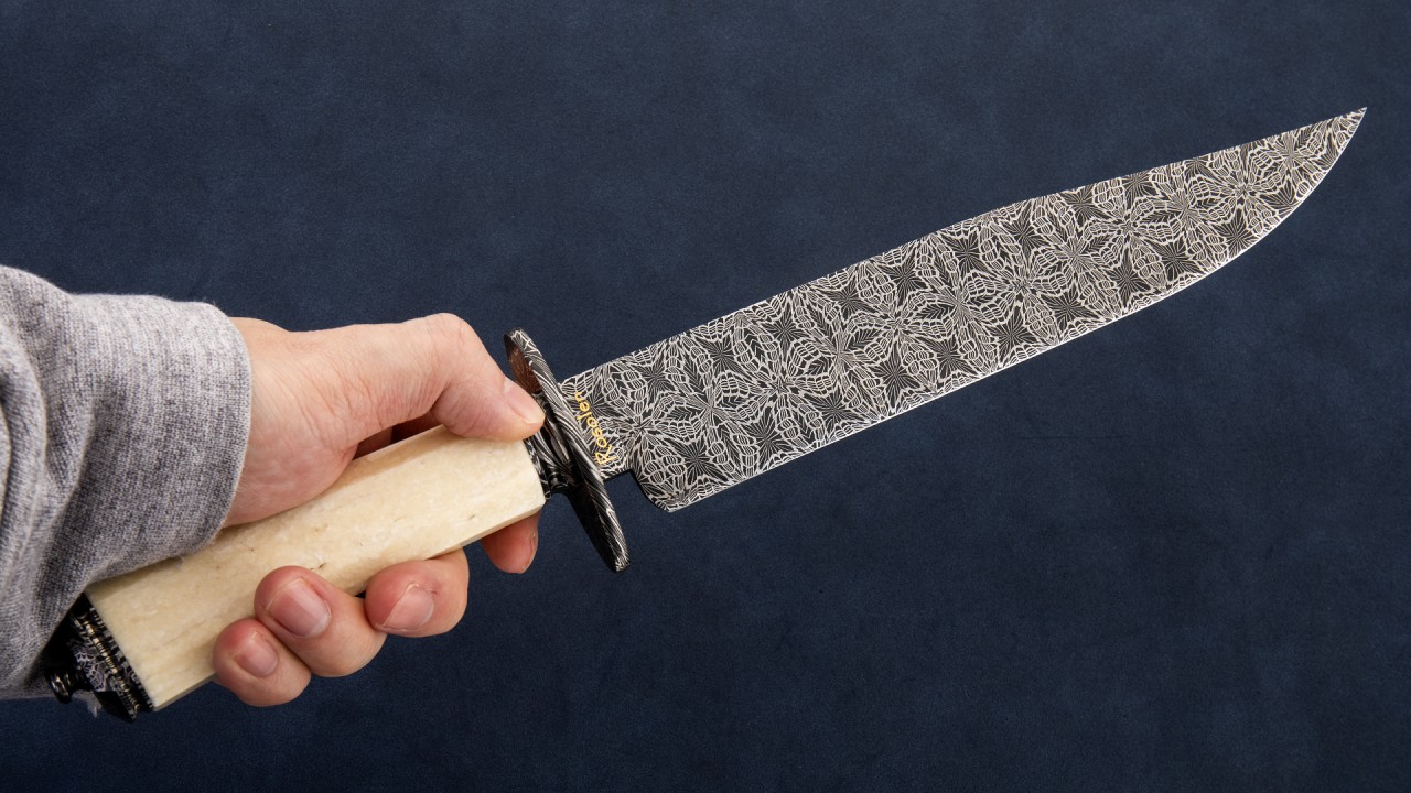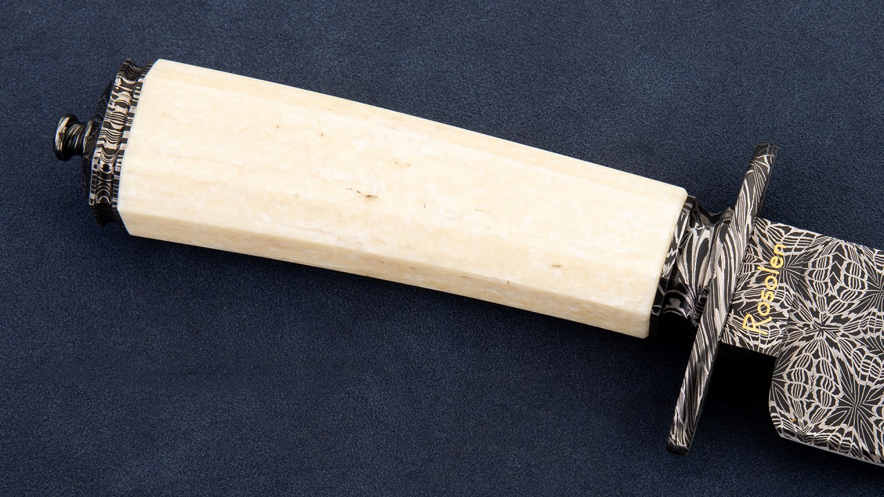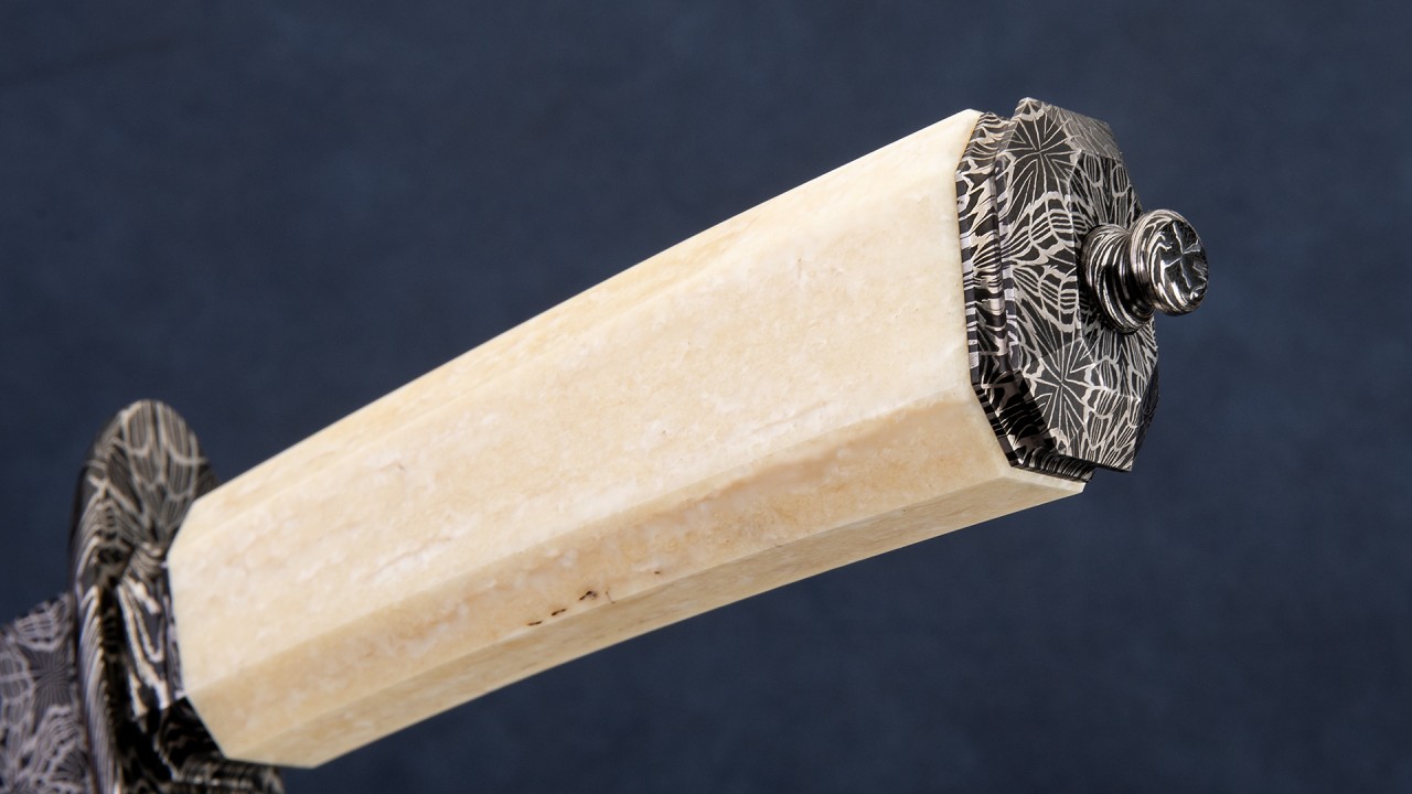 迷宫花海全长39.5厘米,刃长25厘米,裸重445克。刀刃采用丹尼尔锻造大马士革制成,花纹复杂细密,如同古典庄园里植物构建的迷宫走廊,让人眼花缭乱。刀刃末端带有黄金镶嵌的铭文。大马士革护手、刀颈以及尾铁,每一个细节都打磨得非常出色。刀柄采用化石海象牙制作而成,被修饰成棱角分明的柱状外形,如同大理石石柱一般,古典庄重。作品带有美国著名鞘师保罗隆打造的精美刀鞘,完美匹配宝刀。