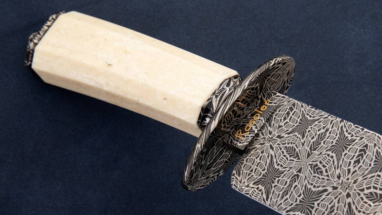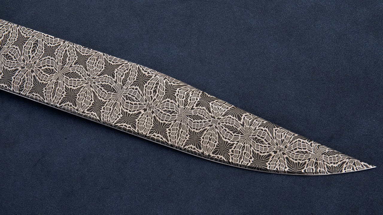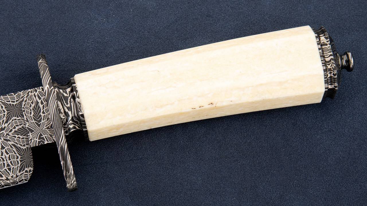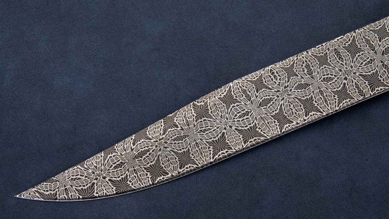 迷宫花海全长39.5厘米,刃长25厘米,裸重445克。刀刃采用丹尼尔锻造大马士革制成,花纹复杂细密,如同古典庄园里植物构建的迷宫走廊,让人眼花缭乱。刀刃末端带有黄金镶嵌的铭文。大马士革护手、刀颈以及尾铁,每一个细节都打磨得非常出色。刀柄采用化石海象牙制作而成,被修饰成棱角分明的柱状外形,如同大理石石柱一般,古典庄重。作品带有美国著名鞘师保罗隆打造的精美刀鞘,完美匹配宝刀。
