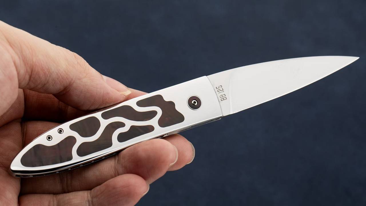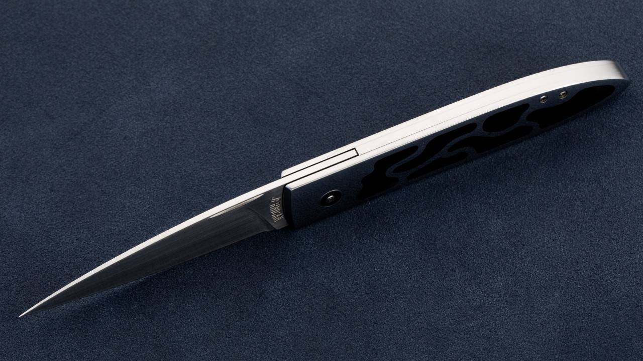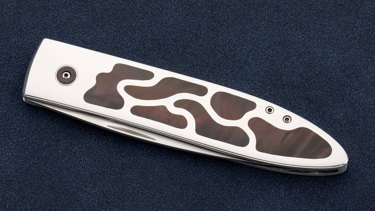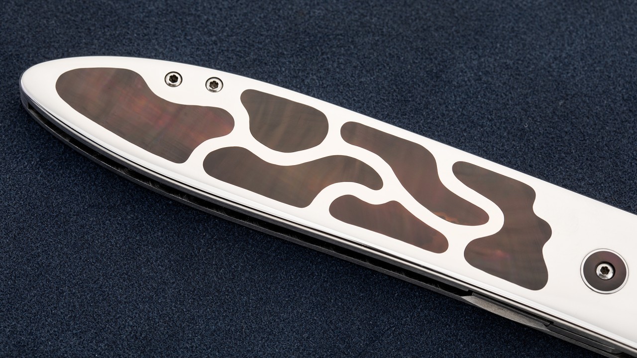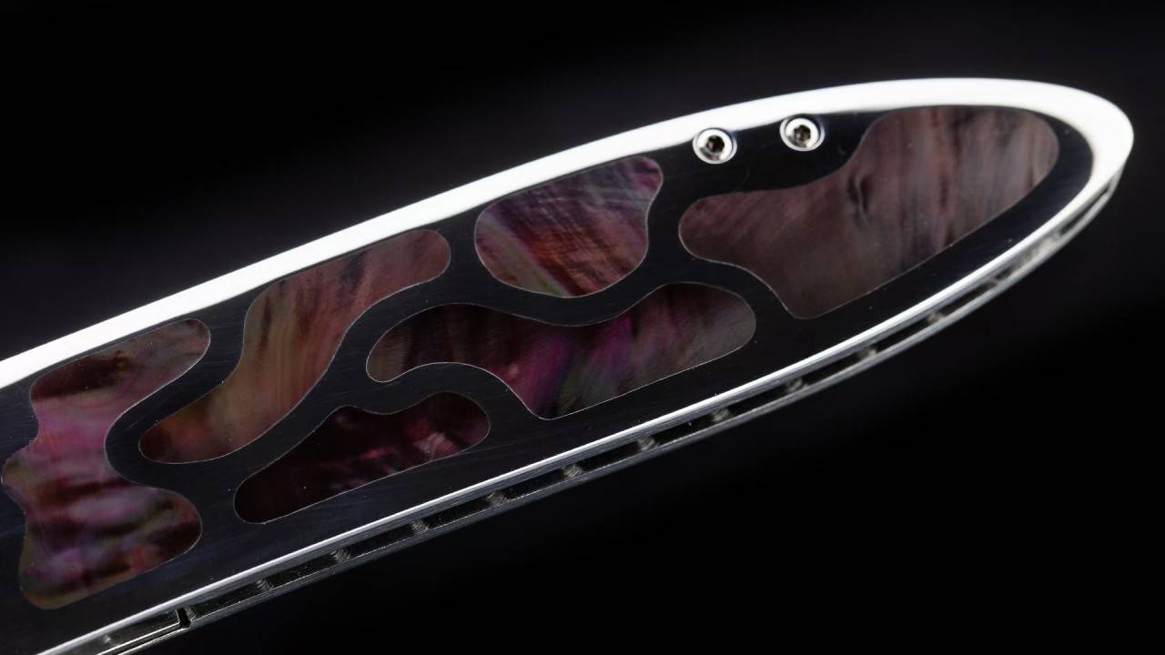 全长16.3厘米,刃长6.5厘米,裸重65克,刀刃采用ATS34不锈钢制作而成,手工缎面拉丝处理刃面,笔直细腻。刀柄采用416不锈钢制作而成,刀柄每侧制作了6块镂空,外形复杂,边缘过渡极为精准,展现了史蒂夫精湛无比的细节操作能力。镂空区域镶嵌了深海黑贝母,贝母色彩深邃梦幻,在光线下欣赏极富变幻,如同极地夜空散发的淡淡极光,极富诗情画意之美。