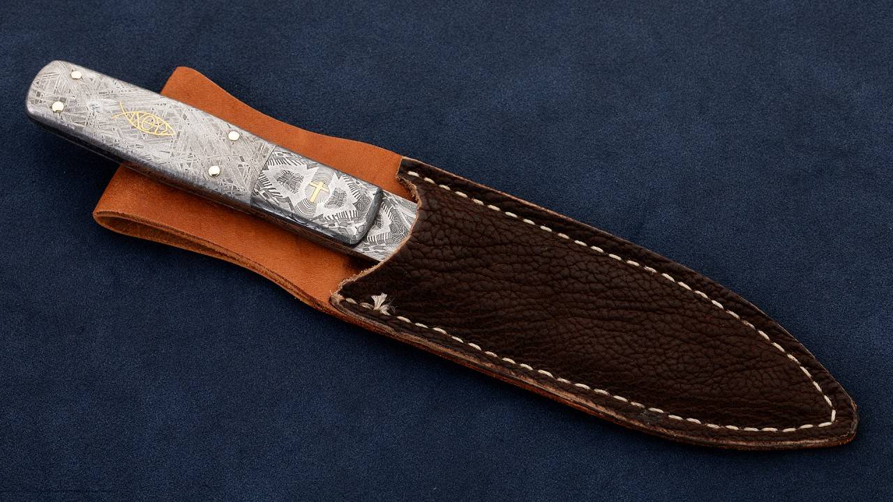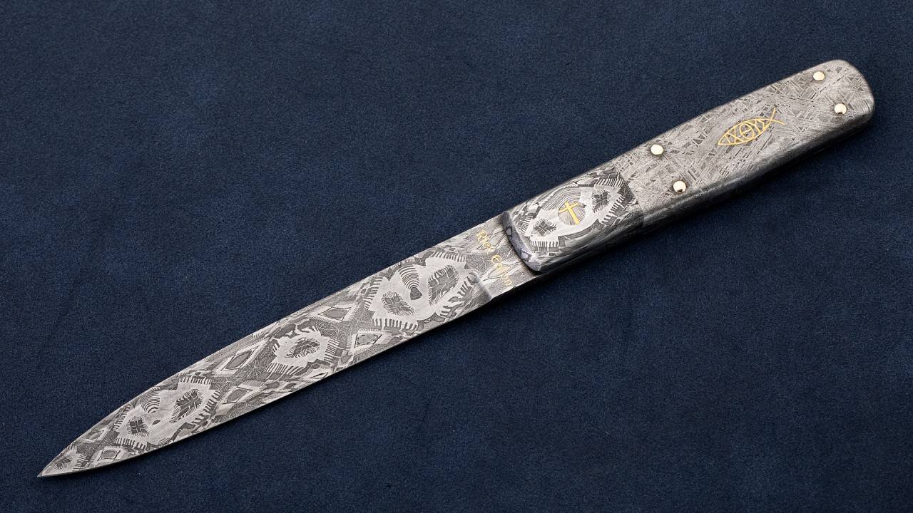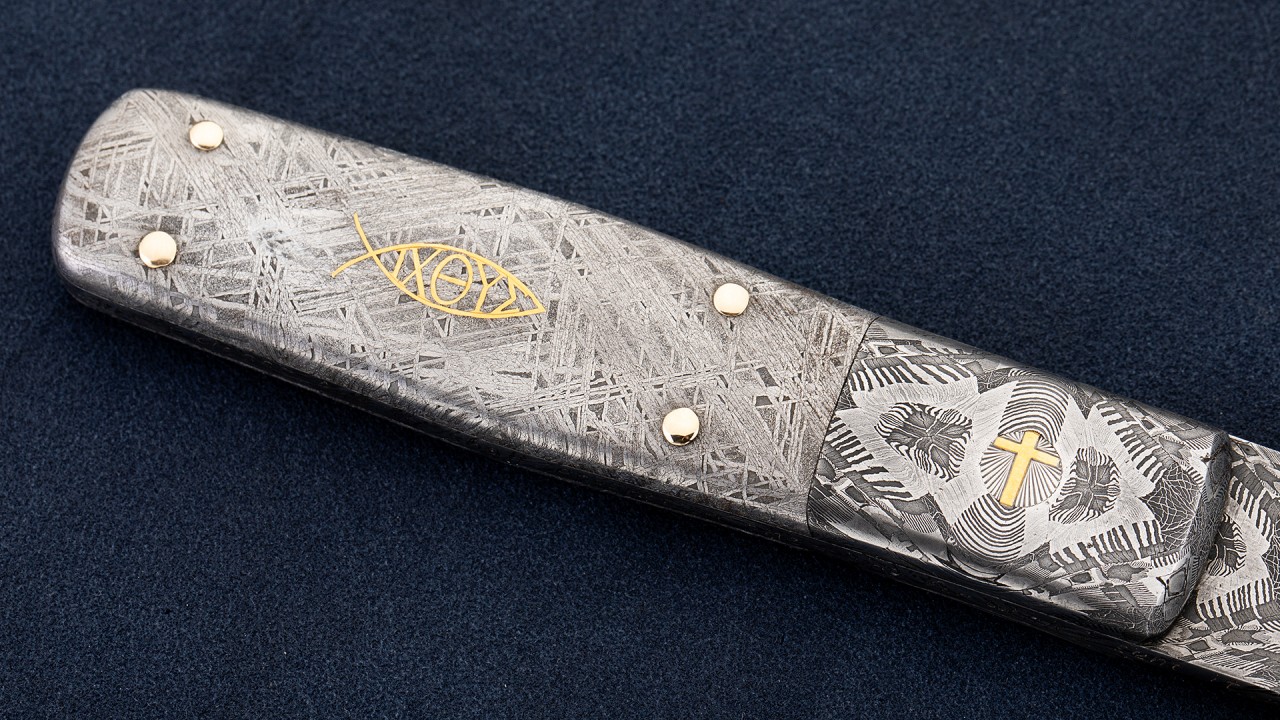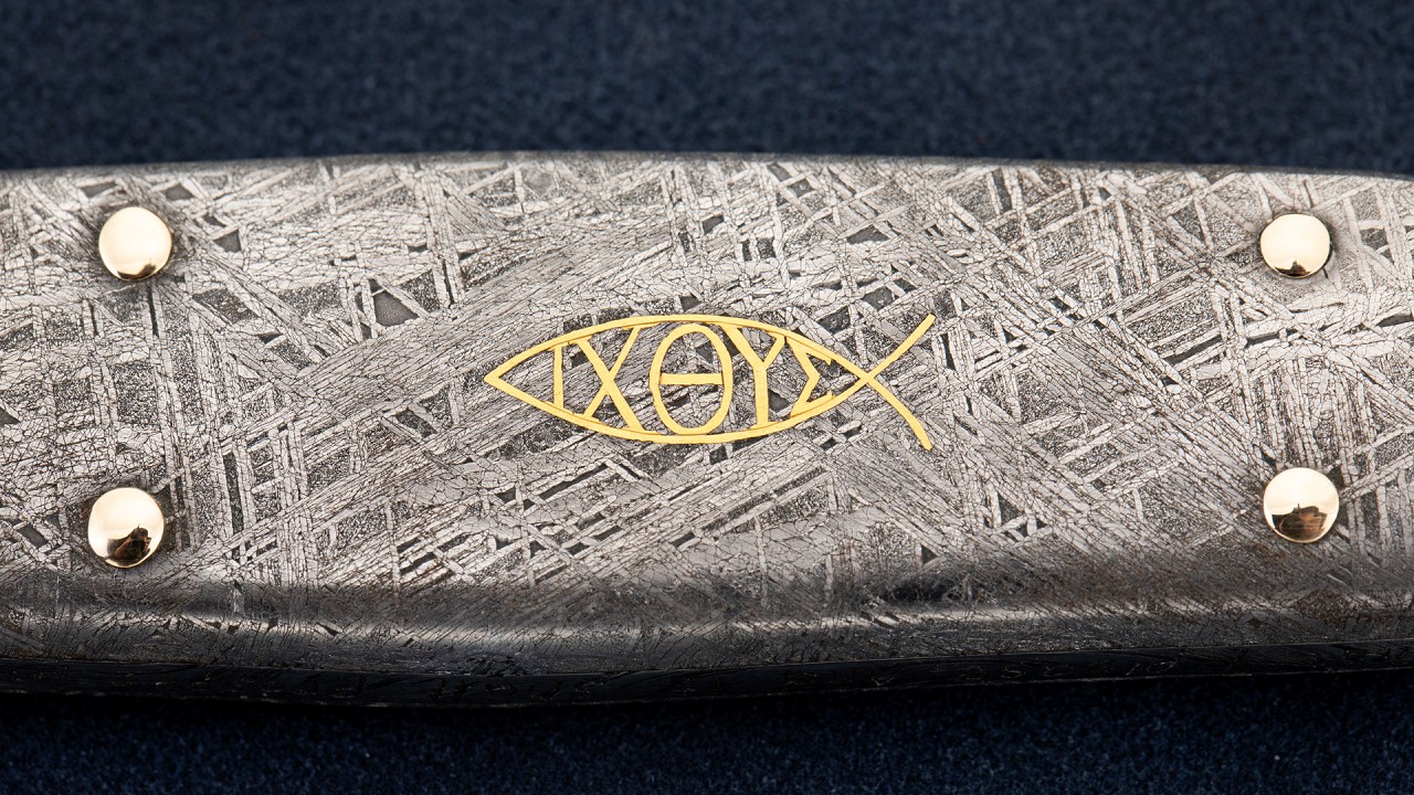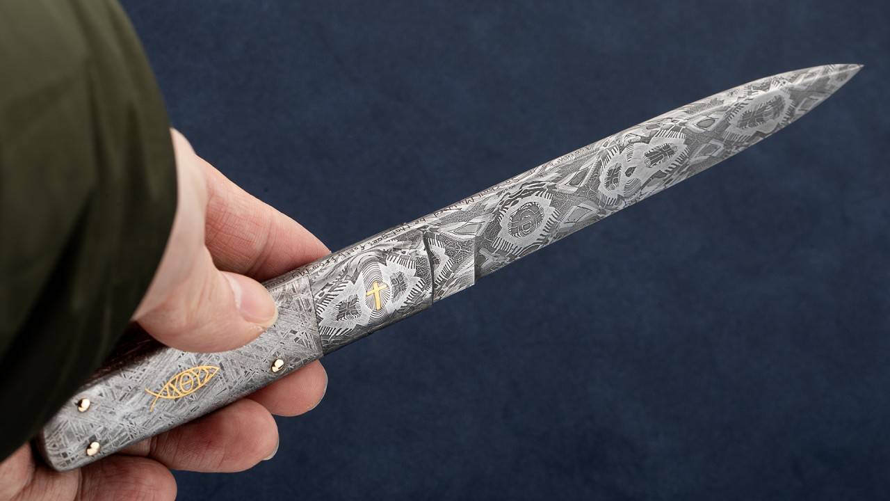 全长22.5厘米,刃长12.5厘米,裸重165克。作品为全龙骨直刀,刀刃与护手均为瑞克锻造的大马士革制作而成,花纹非常复杂;大马士革局部带有如同风中飘扬的旗帜一般的规则图案,细节还有十字架花纹;刀刃中心花纹呈现出瞳孔形状,到护手处瞳孔最为明显,并在中心镶嵌了黄金的十字架,以此寓意神之眼。刀柄两侧镶嵌了两块巨大的陨铁贴片,并用14K黄金铆钉古董,漂亮的天外纹理也是赞美上帝最佳的纹理象征;陨铁上还镶嵌了黄金制成的基督鱼符号。