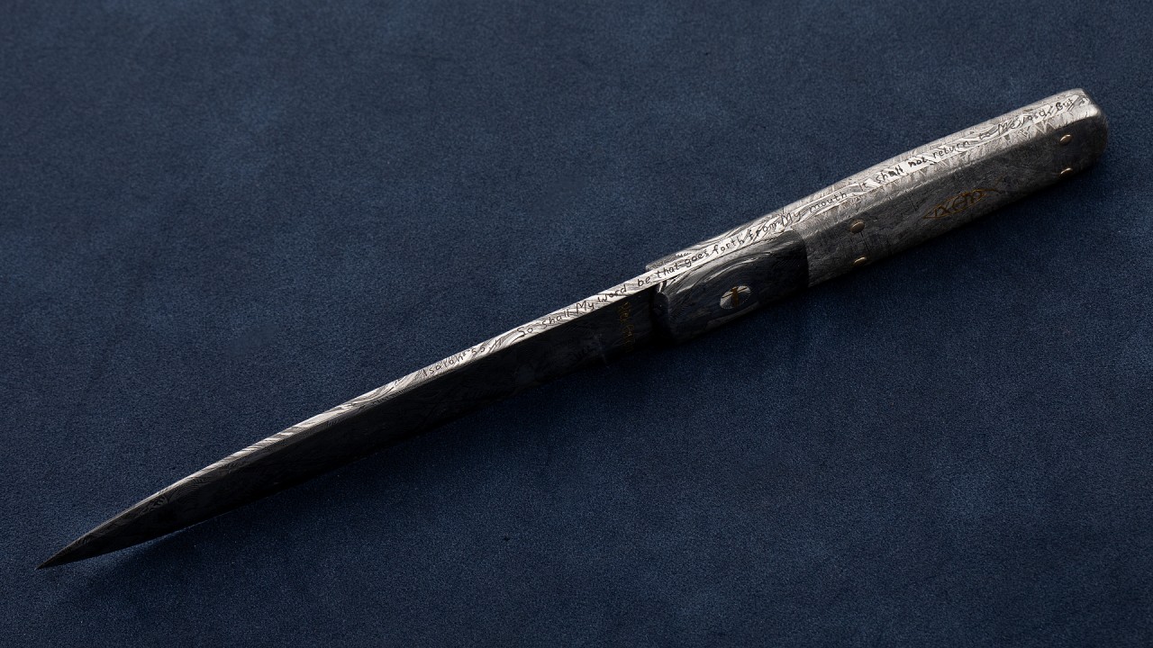 宗教主题艺术刀精品,由美国艺术刀大师,AKI成员瑞克.伊顿手工打造,孤品唯一。瑞克为家族第二代继承人,其父就是当时知名的刀剑大师。瑞克可谓青出于蓝而胜于蓝,年轻时就掌握了全方位的雕刻技法,后来在锻造领域也是当仁不让,成为了世界刀坛少有的“全能大师”。瑞克多次获得刀界大奖,其作品涵盖了各种直刀以及折刀,其本人也受到过美国电视台专访。