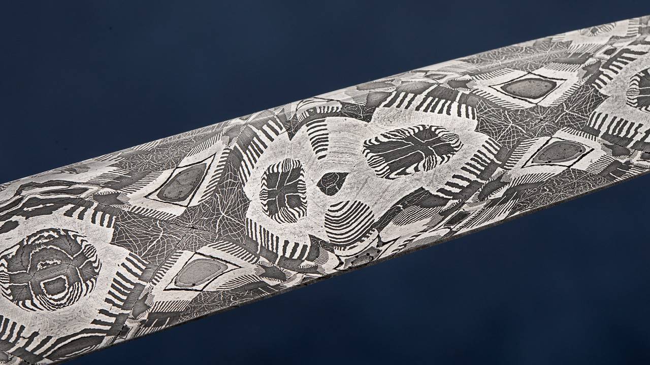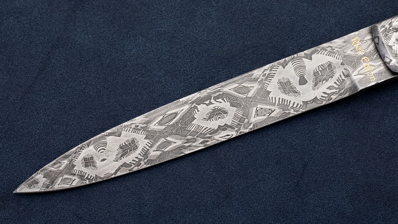 此件作品在瑞克的作品里也属于相当独特的存在,将宗教文化完美融合在一把刀剑作品中,通过大马士革的纹理以及雕刻的细节表达高远的意境。同时作品手感也非常出色,作为优秀猎刀的属性毫无缺失。此件作品的LOGO也是瑞克独立的设计,其中的T被刻画成了一把十字剑的形状,可见对作品的重视。