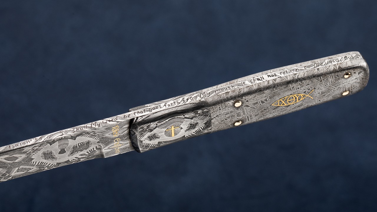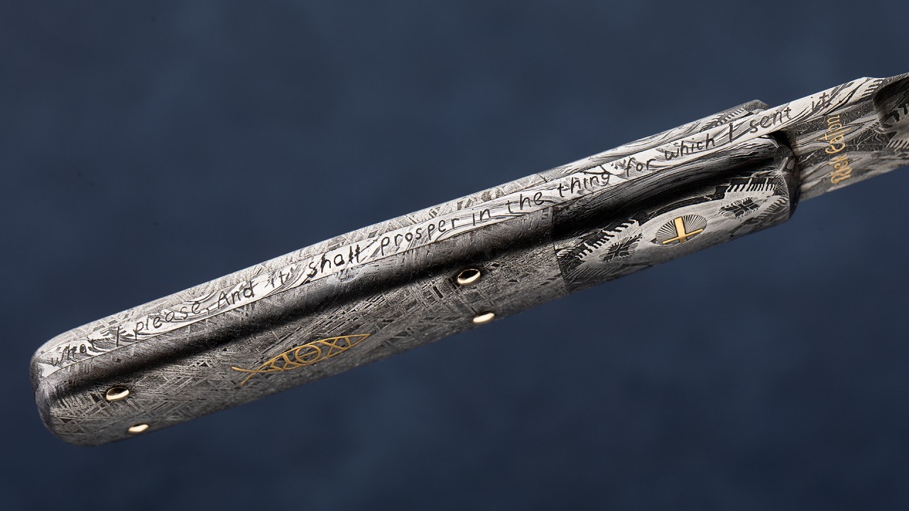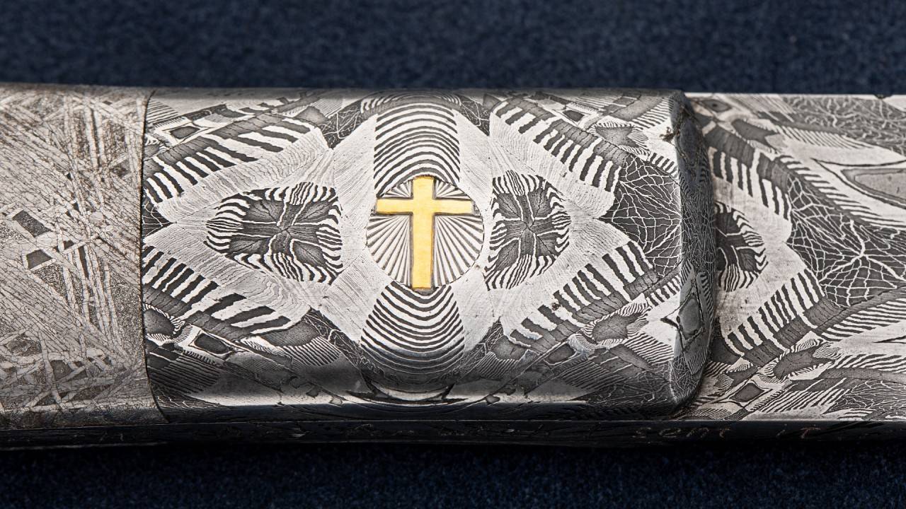刀柄两侧雕刻了以赛亚书55:11的话语,“我口所出的话也必如此,决不徒然返回,却要成就我所喜悦的,在我发他去成就的事上必然亨通。”这句话强调了上帝的话语的确定性和不可改变性,表明上帝的话语一旦发出,就会实现其预定的目的,并且会带来成功和繁荣,强调上帝的主权以及对人类命运的掌控。