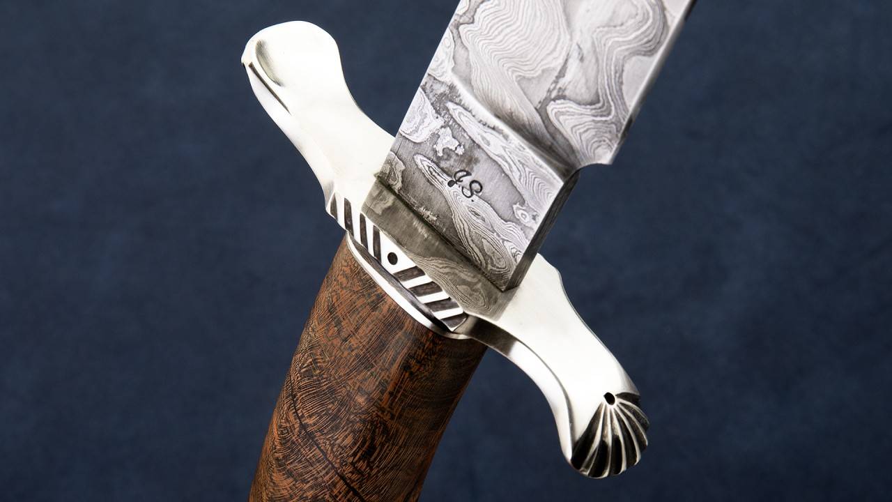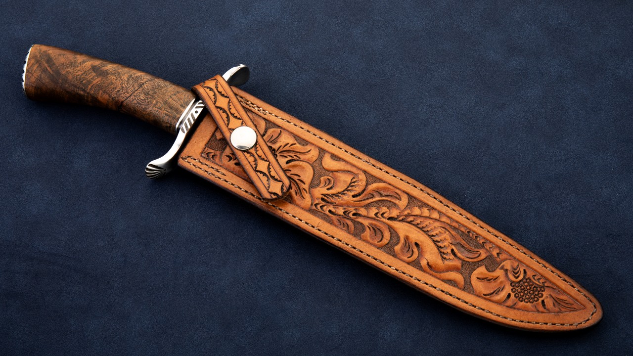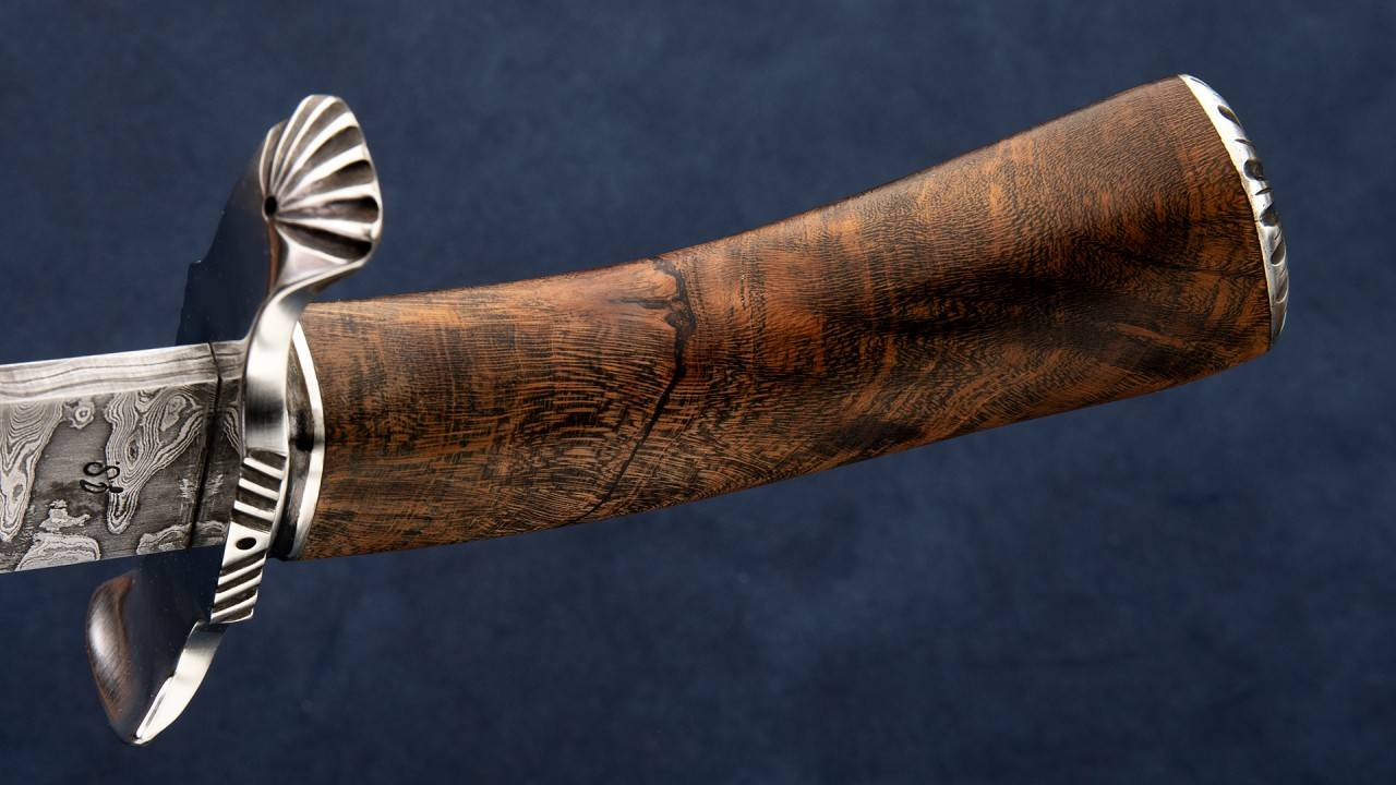 此件作品是大卫JS时期作品,全长35.8厘米,刃长24厘米,裸重326克。刀刃采用大卫锻造夹钢大马士革制作而成,花纹连贯动感,张力十足。精美的S型护手,两端带有贝壳塑形,古韵十足。枫木刀柄,握感饱满细腻。精美的锉花尾铁打磨成经典花瓣外形,优雅别致。带有漂亮雕花刀鞘,是纯正的ABS博伊刀,舍得实用也是户外野营优秀伙伴。