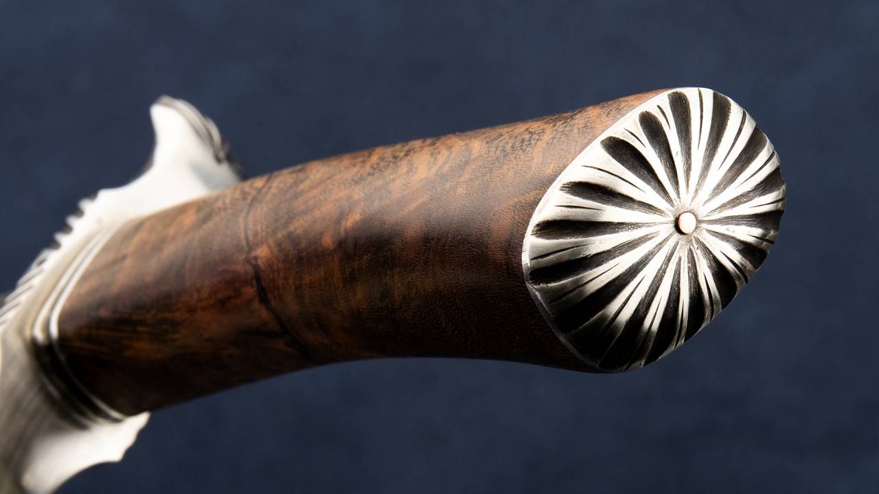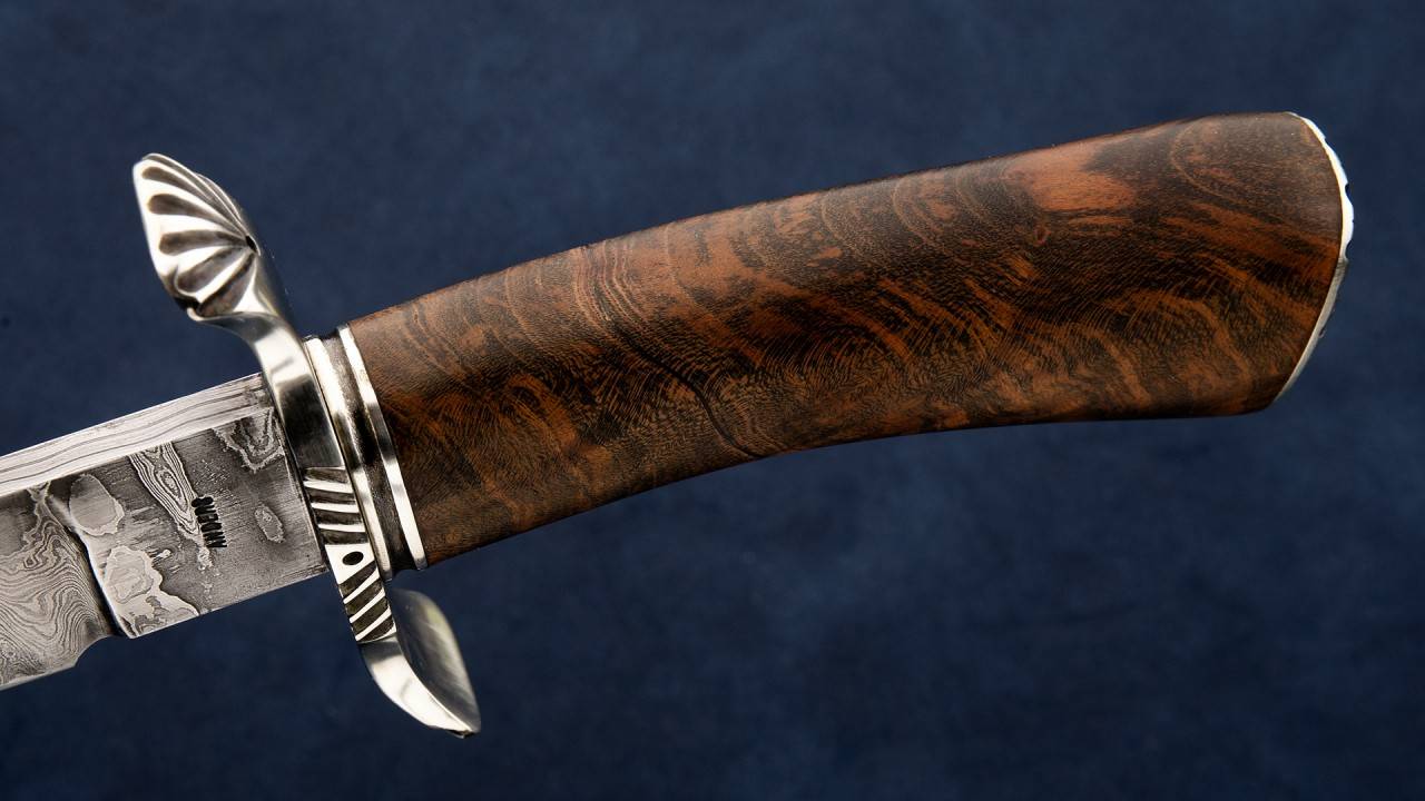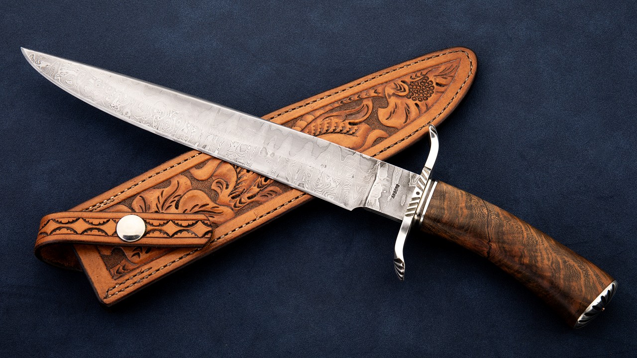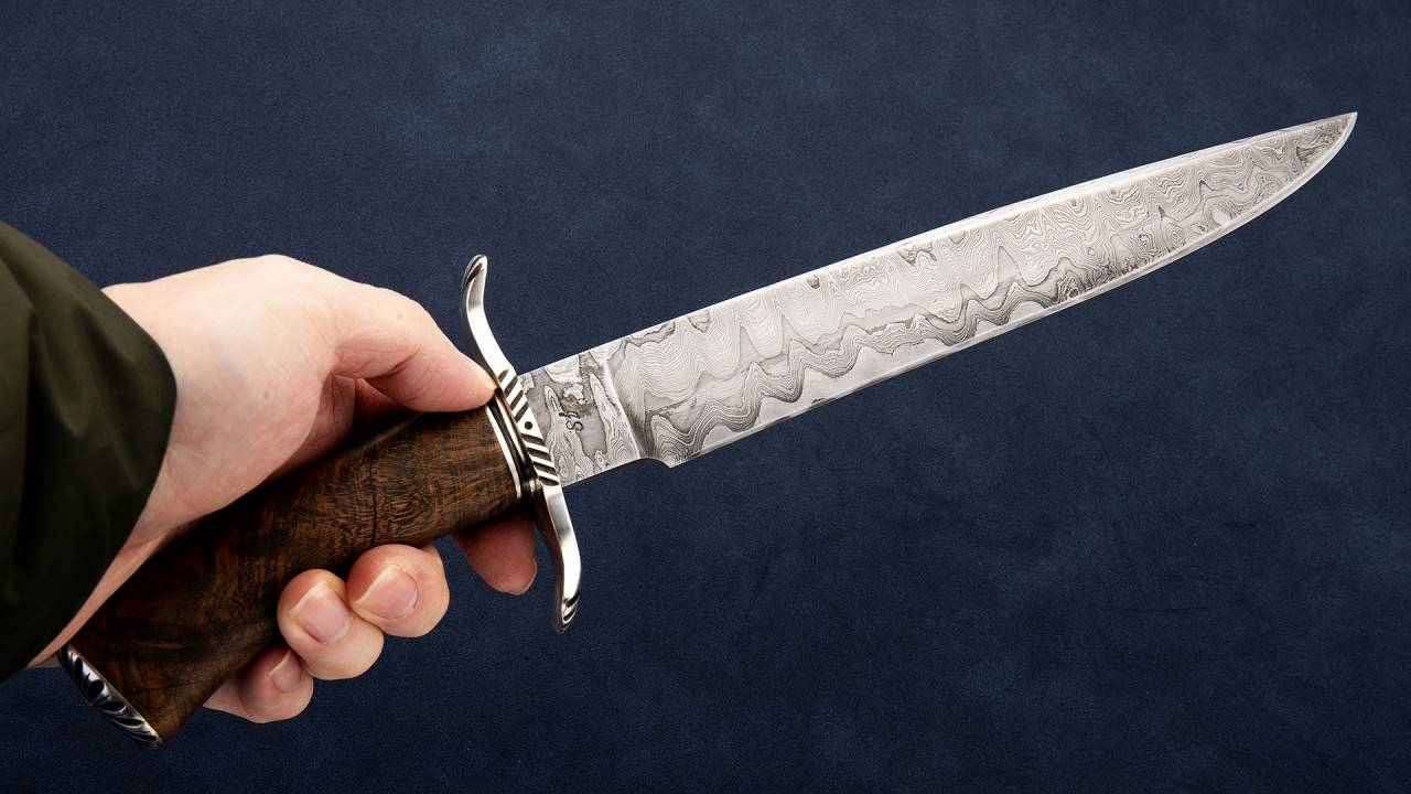此件作品是大卫JS时期作品,全长35.8厘米,刃长24厘米,裸重326克。刀刃采用大卫锻造夹钢大马士革制作而成,花纹连贯动感,张力十足。精美的S型护手,两端带有贝壳塑形,古韵十足。枫木刀柄,握感饱满细腻。精美的锉花尾铁打磨成经典花瓣外形,优雅别致。带有漂亮雕花刀鞘,是纯正的ABS博伊刀,舍得实用也是户外野营优秀伙伴。