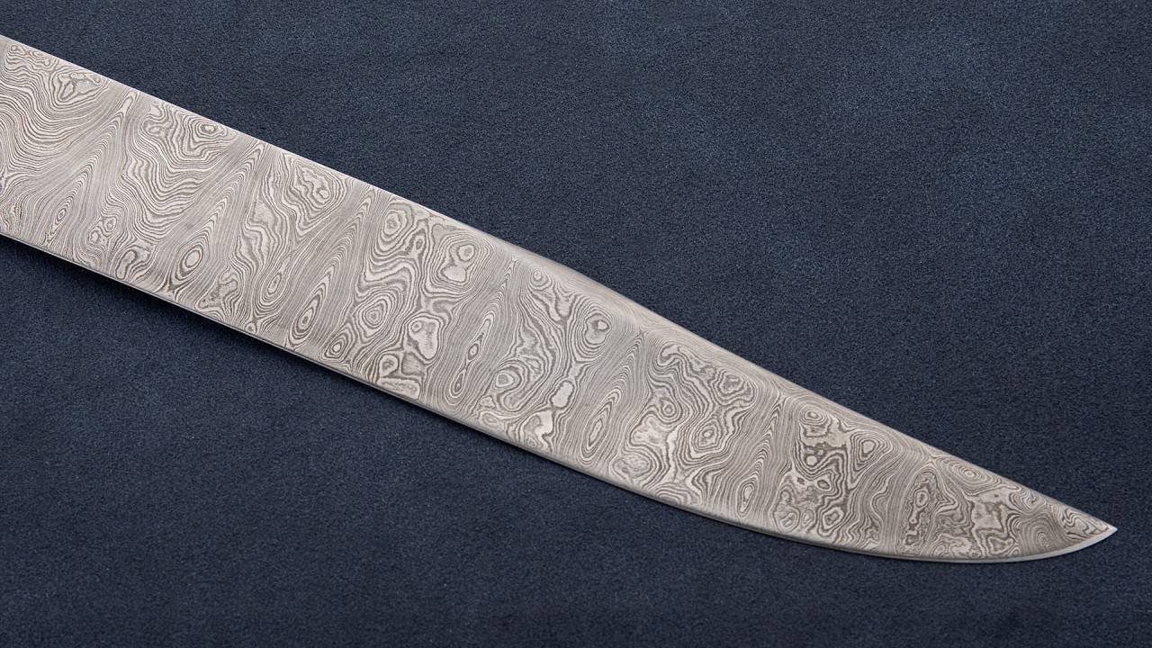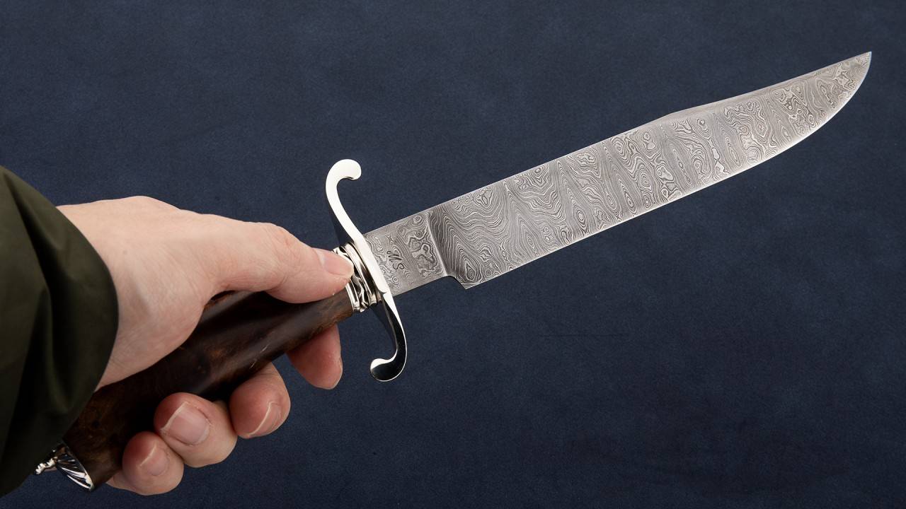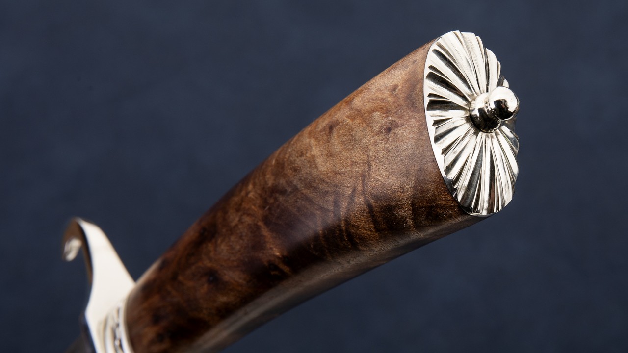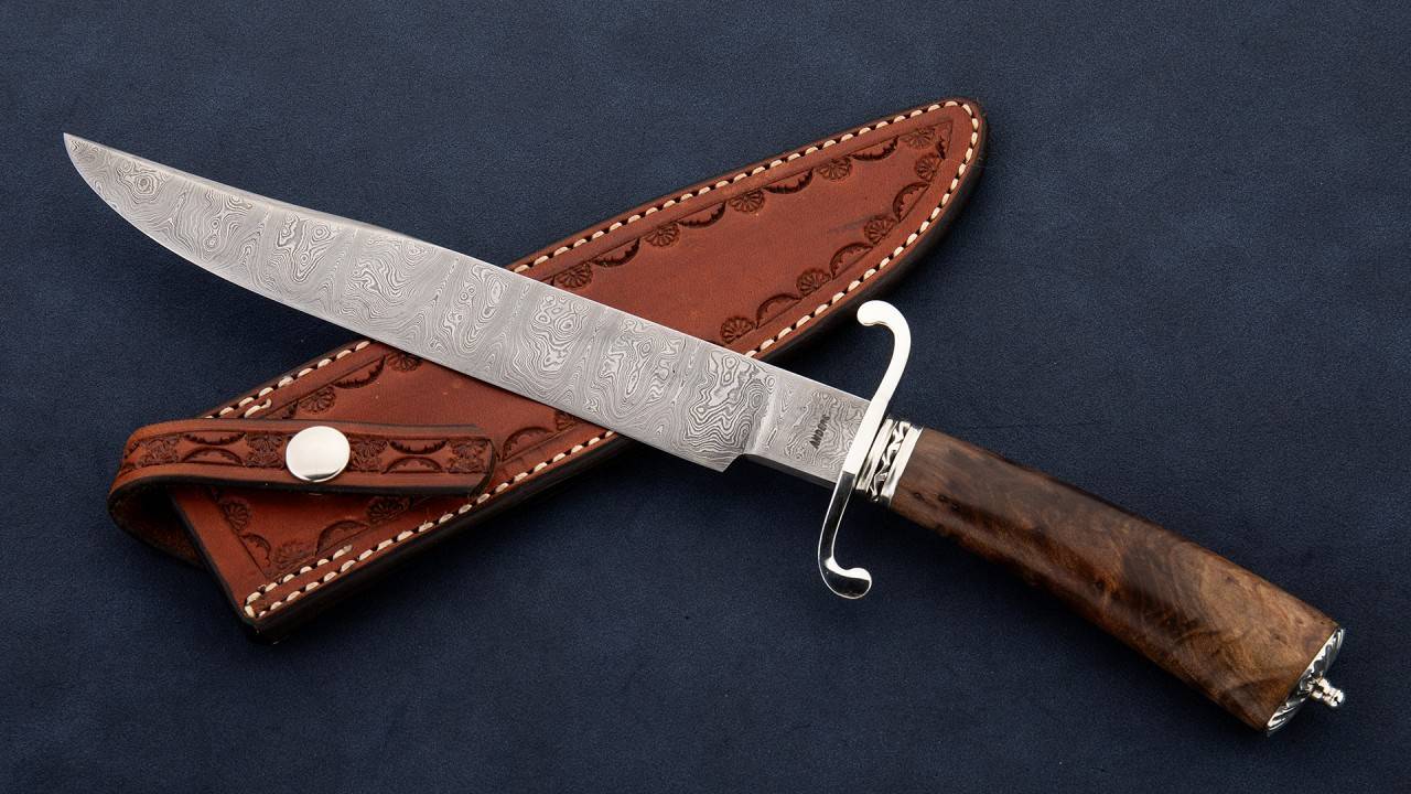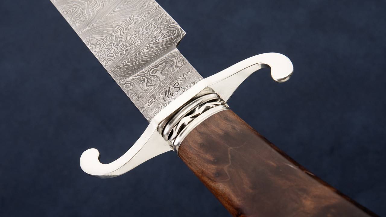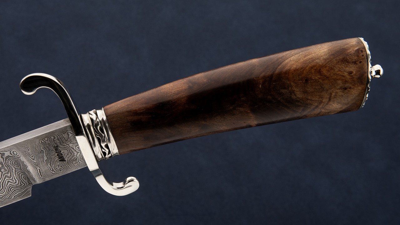 此件作品是标准的ABS绅士博伊刀款,全长33.5厘米,刃长20.5厘米,裸重201克,鞘重111克。刀刃采用大卫锻造天梯大马士革制作而成,花纹连贯动感,张力十足。精美的S型护手,打磨细腻,刀颈带有精美锉花装饰。枫木刀柄,握感饱满细腻。精美的锉花尾铁打磨成经典花瓣外形,优雅别致。带有原配刀鞘,是纯正的ABS博伊刀,舍得实用也是户外野营优秀伙伴。