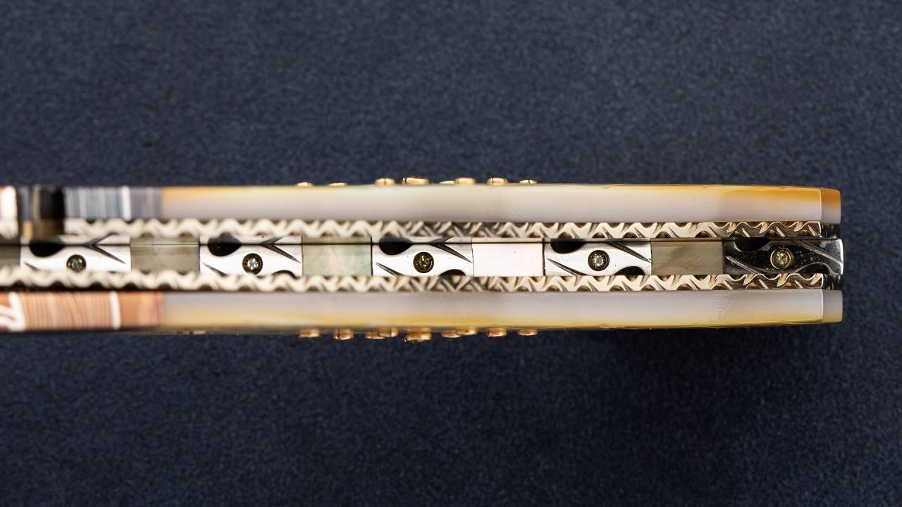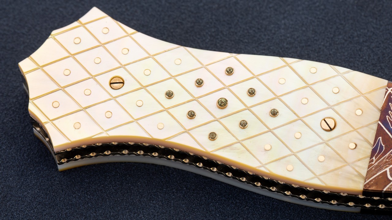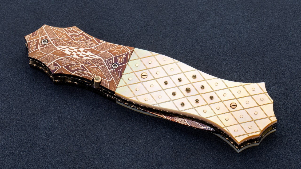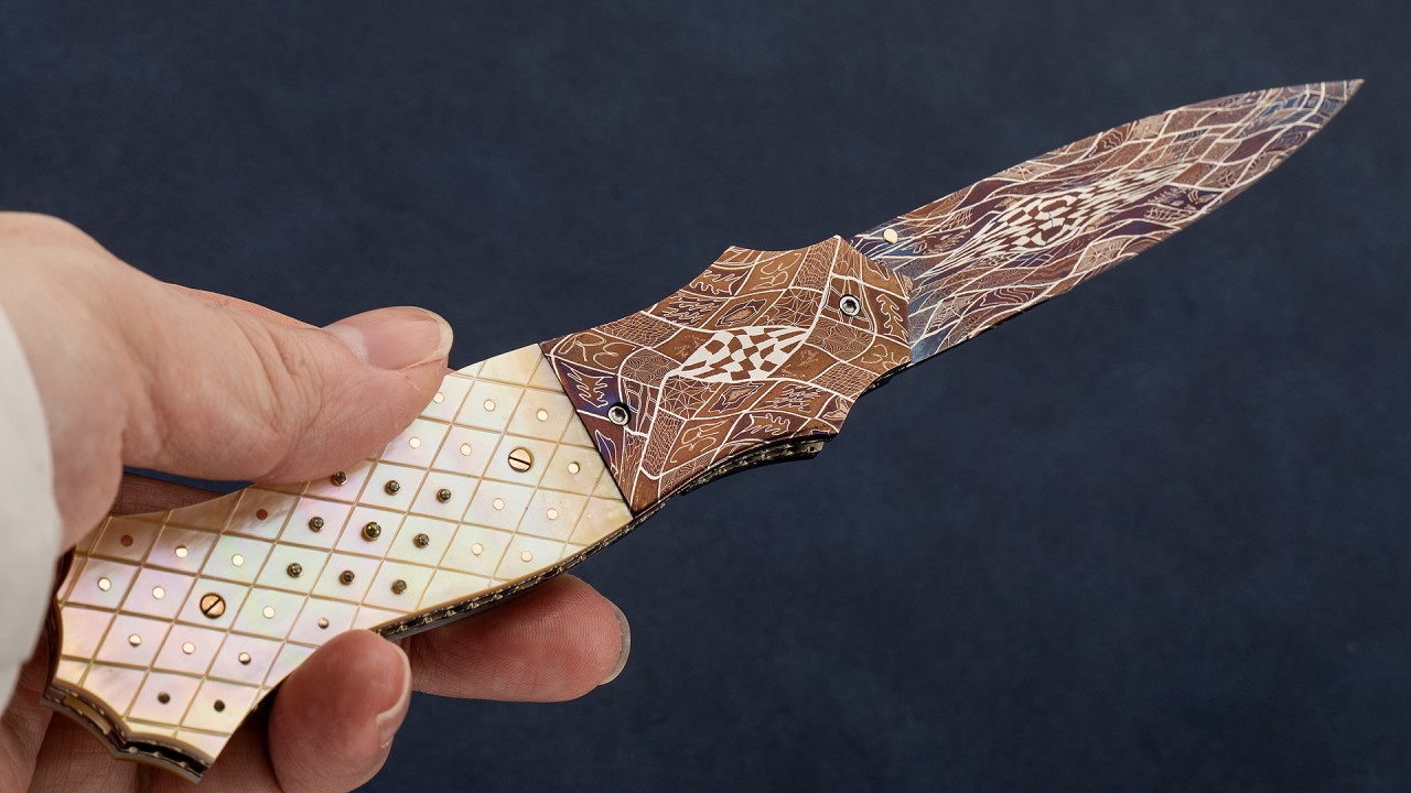 全长21.2厘米,刃长8.5厘米,裸重167克。刀刃刀柄均采用罗伯特马赛克大马士革制作而成,大马士革花纹细腻,如同在四维空间中,各种图案的网格图案扭曲交织在一起,配上梦幻般的烤色,散发出无穷魅力。黄金宝石推钮开刀,开合顺滑细腻。刀柄中部镶嵌金色贝母贴片,色彩美艳如同耀眼的天光;贝母上做了规整的棋盘纹雕刻,每一个格子中镶嵌了18K金铆钉,中心的网格则镶嵌了宝石妆点。