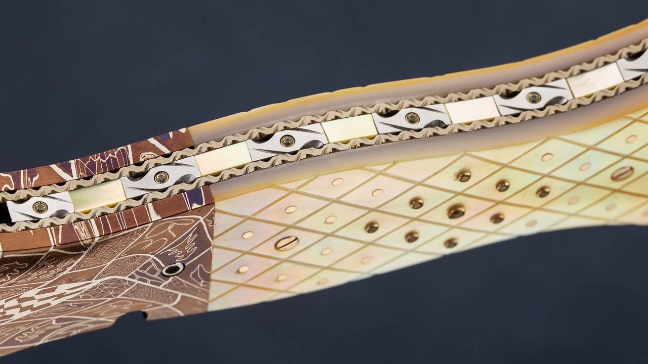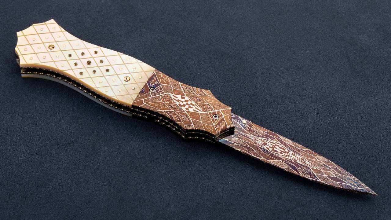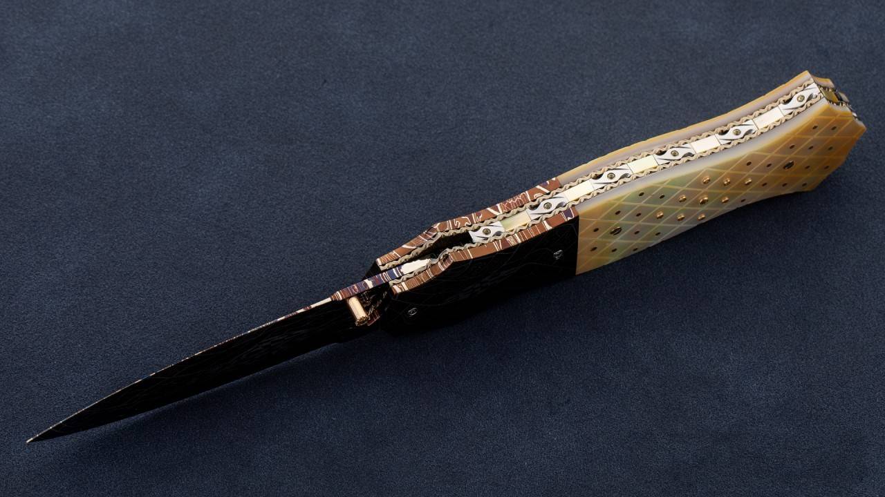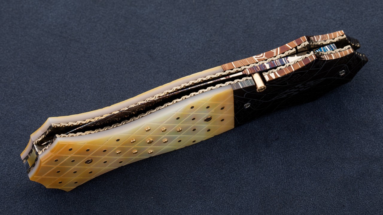 全长21.2厘米,刃长8.5厘米,裸重167克。刀刃刀柄均采用罗伯特马赛克大马士革制作而成,大马士革花纹细腻,如同在四维空间中,各种图案的网格图案扭曲交织在一起,配上梦幻般的烤色,散发出无穷魅力。黄金宝石推钮开刀,开合顺滑细腻。刀柄中部镶嵌金色贝母贴片,色彩美艳如同耀眼的天光;贝母上做了规整的棋盘纹雕刻,每一个格子中镶嵌了18K金铆钉,中心的网格则镶嵌了宝石妆点。