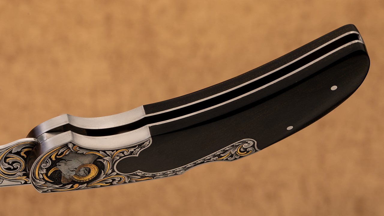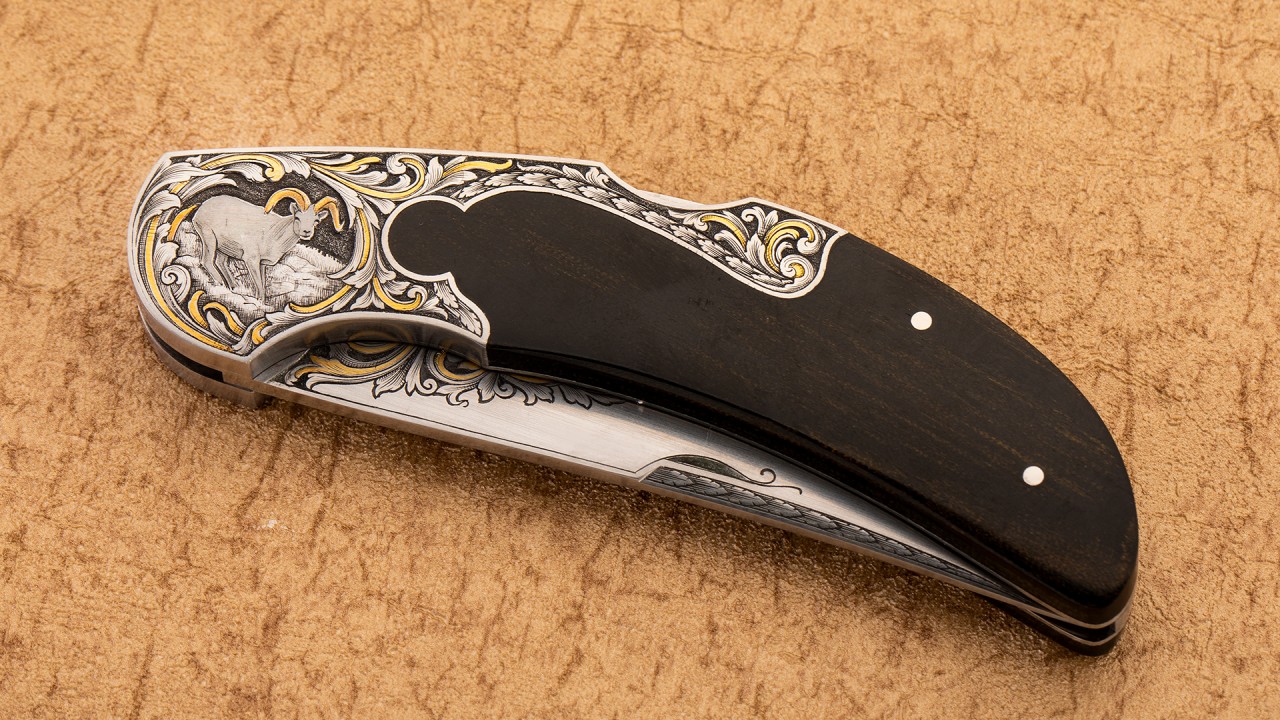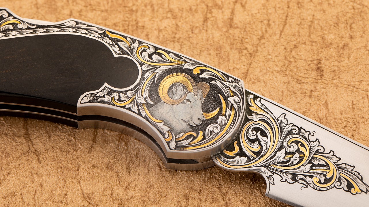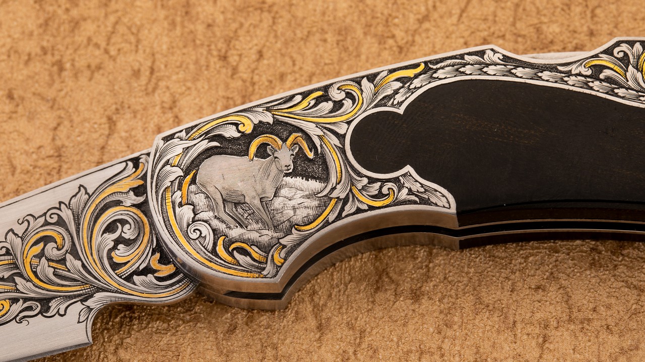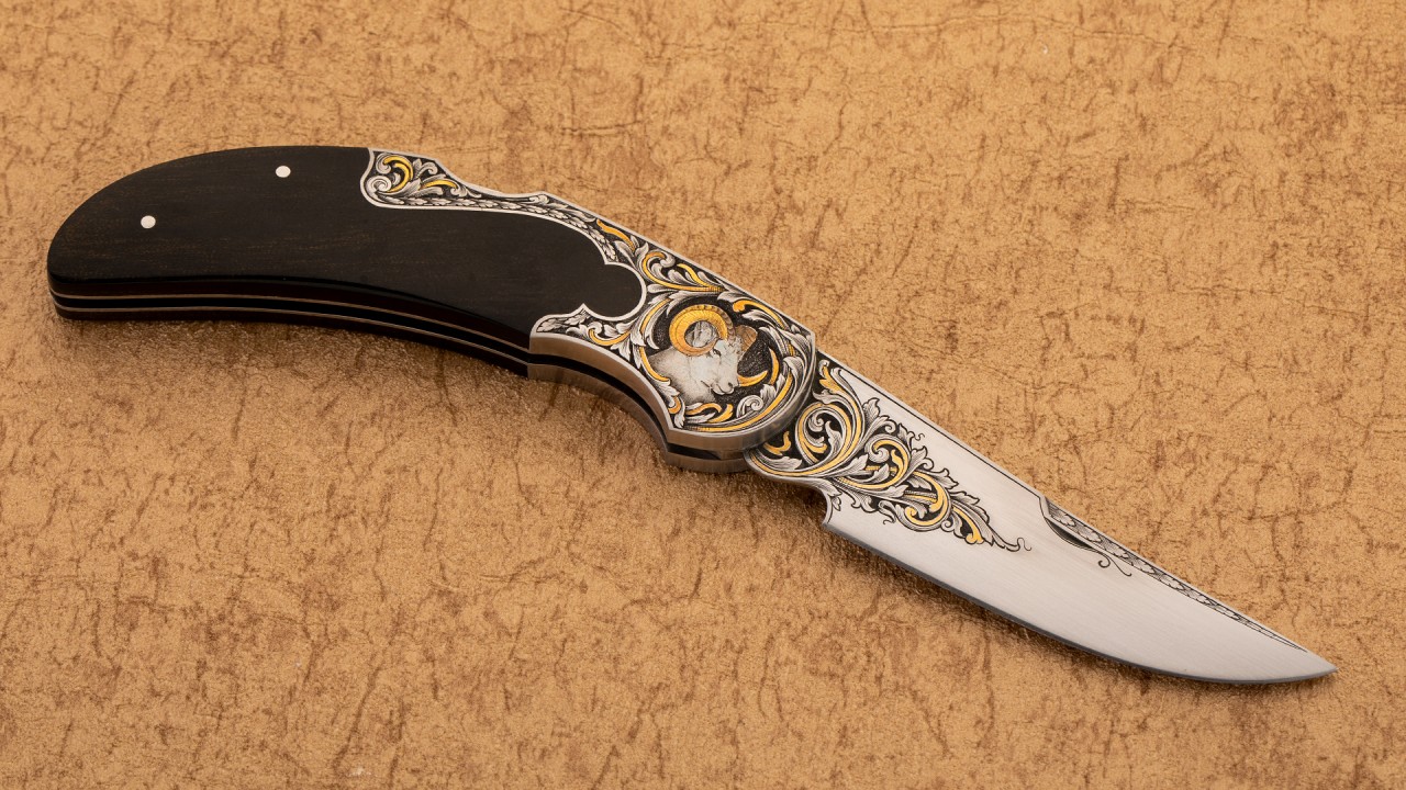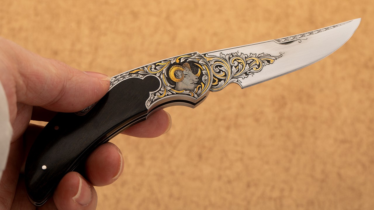作品全长16.6厘米,刃长7厘米,裸重99克。刀刃为ATS34不锈钢制作而成,手工缎面拉丝处理刃面,刀刃接近半数区域雕刻了美妙的卷叶雕刻并镶嵌黄金装饰细节。刀柄采用416不锈钢以及美洲山羊角制作而成,复杂的钥匙孔设计刀柄,背锁机构锁定。刀柄不锈钢区域将刀刃的雕刻图案美妙延伸,一侧雕刻了羊王在山地踱步的画面;另一侧雕刻了羊王威风凌凌的胸像,局部均用到黄金点缀。此件作品外形古典优雅,且不失锐利之气,华丽的雕刻更使其如虎添翼。