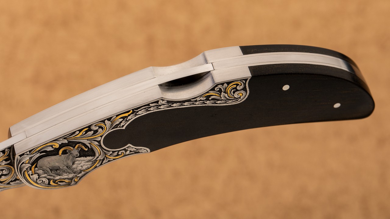 美国雕刻大师罗恩.史密斯手工打造,孤品唯一。罗恩是一位职业雕刻师,从业四十余年,以金属微雕为强项。罗恩有专门著作的金属微雕教学书,也在北美开设雕刻学堂,培育了不少新进优秀从业者。罗恩闲暇之余,也亲手打造过完整的刀具作品用于展现自己精湛的雕刻技艺,从这件作品中我们可以得见这位雕刻大师全方位的技艺。