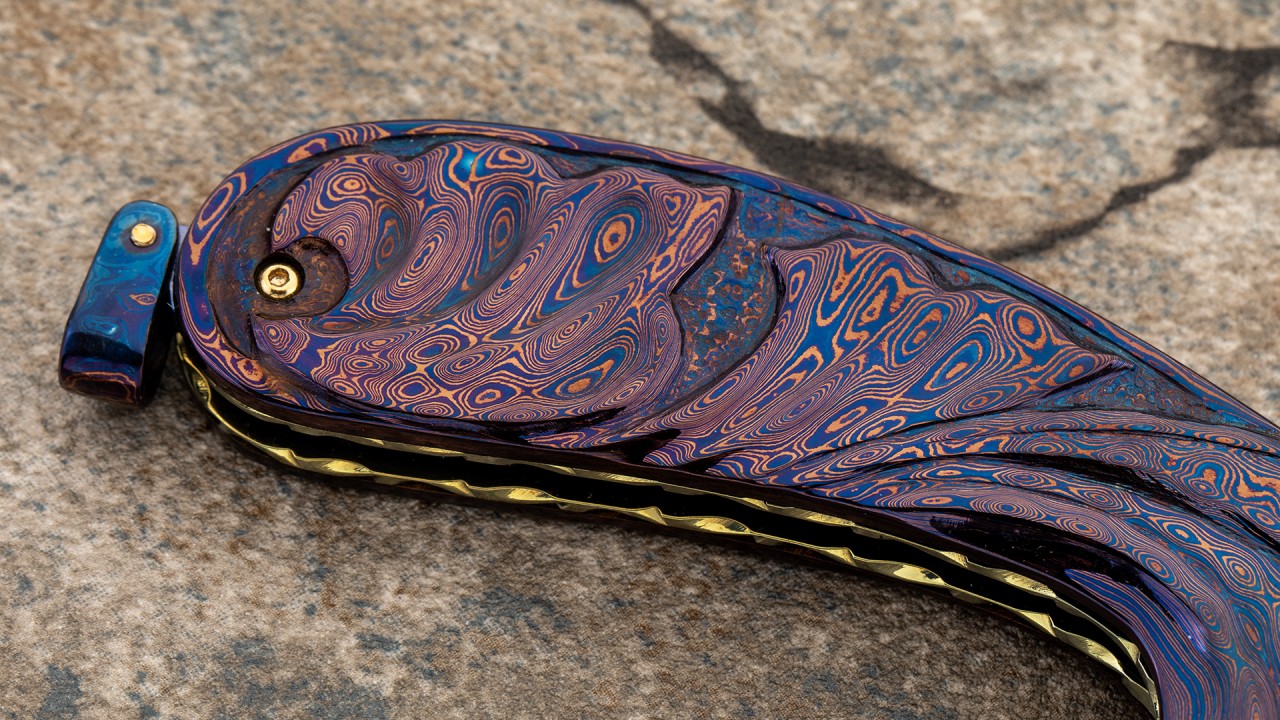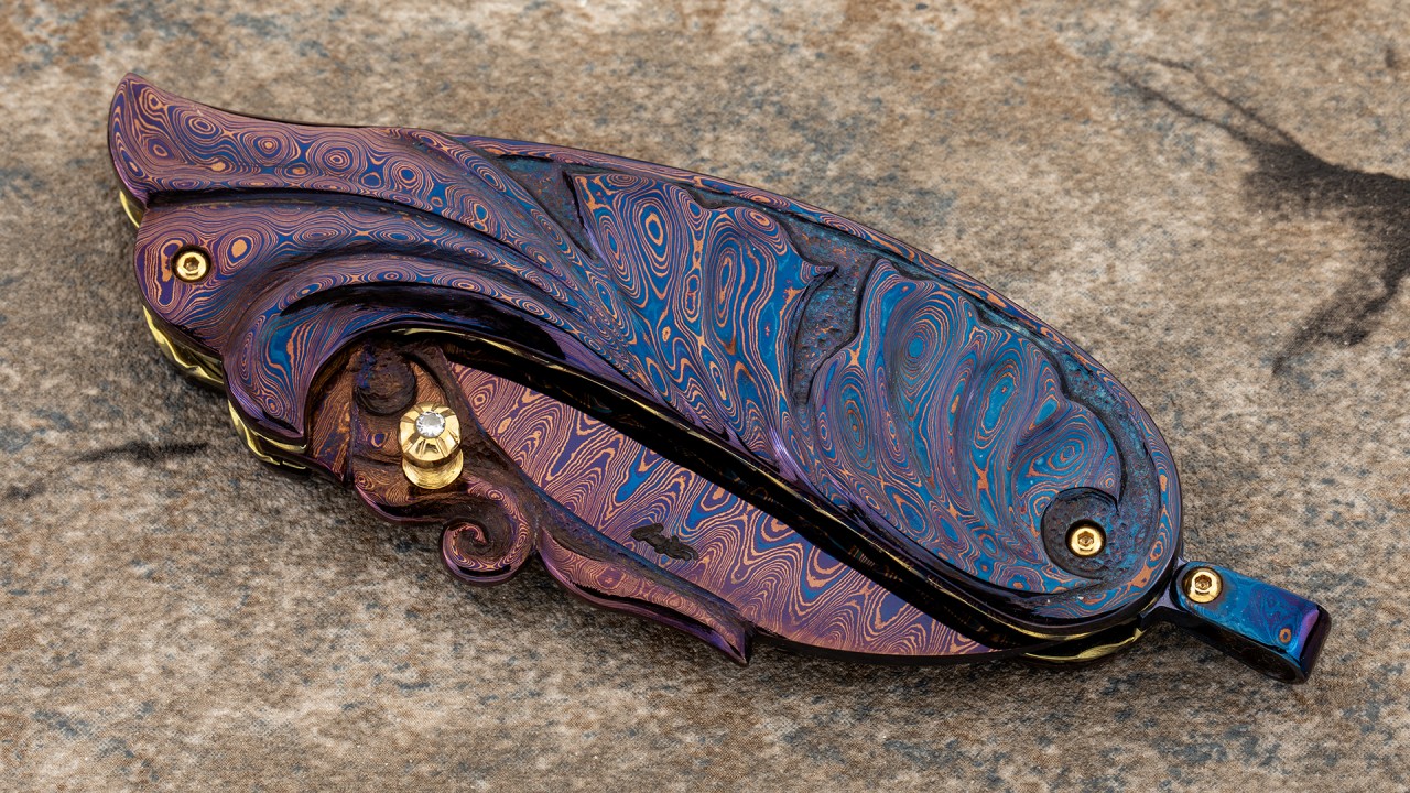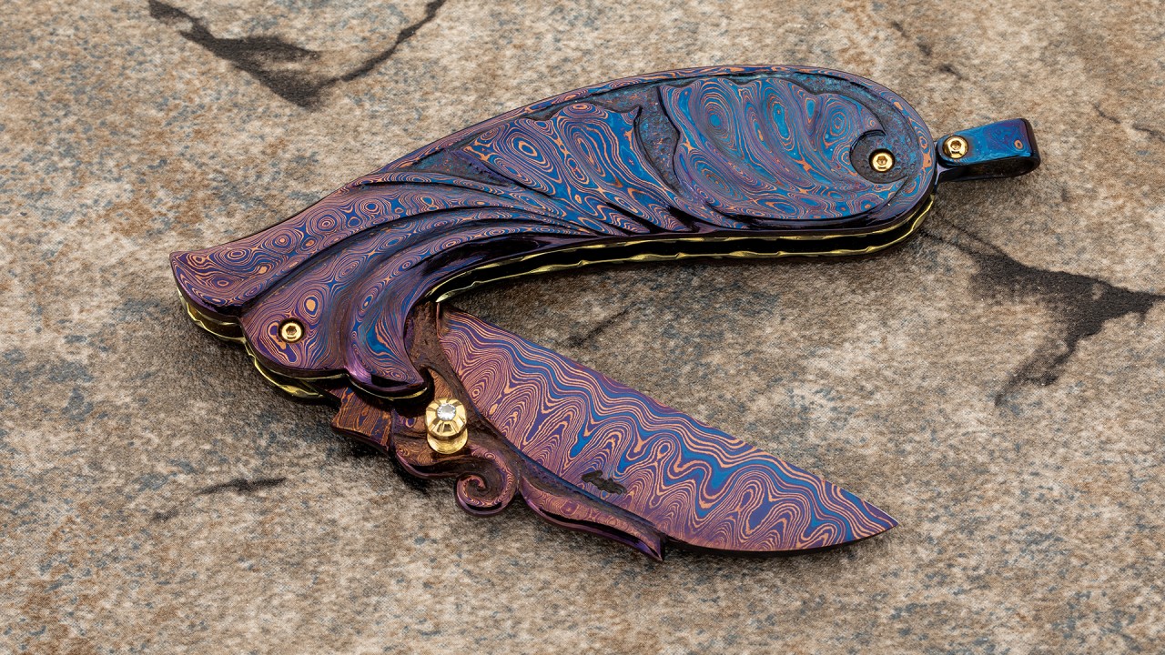 幽蓝蔷薇——美国刀匠协会刀匠舒恰特.江塔隆精品,手工打造,孤品唯一。舒恰特职业制刀20余年,精通雕刻,作品色彩华丽与多元化,时常以动物、植物、神话作为主题,其作品曾多次登上知名杂志和专业书籍。
