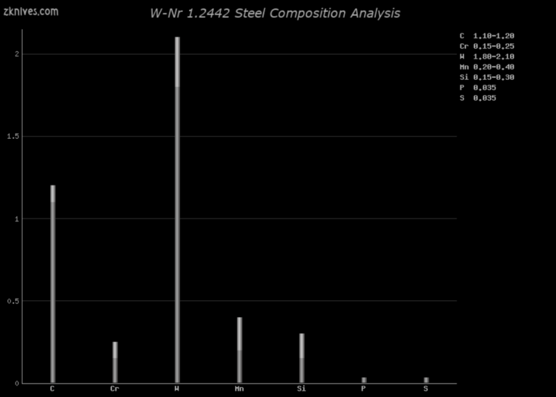 1.2442 钢是由 Lohmann-Stahl 在 Witten 制造的。这种钢材(以及其他几种钢材)是按照 Achim Wirtz 的规格制造的,Achim Wirtz 还与 他们 (Lohmann-Stahl) 是一个为刀具制造商提供不同钢材的人(他订购了几吨,然后在几年内出售)。 1.2442 类似于日立 Aogami 1 钢,碳和铬少一点,但钨 (W) 多一点。与 Aogami 和 Shirogami 系列相比,主要缺点是硫 (S) 和磷 (P) 等污染物的允许量要高得多。尽管如此,具有适当热处理和几何形状的非常不错的合金,适用于正确的任务。