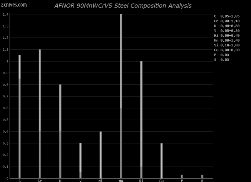 碳(C):0.85%-1.05% 铬(Cr):0.40%-1.10% 钨(W):0.40%-0.80% 钒(V):0.05%-0.30% 镍(Ni):0.00%-0.40% 锰(Mn):0.60%-1.40% 硅(Si):0.10%-1.00% 铜(Cu):0.00%-0.30% 磷(P):0.03% 硫(S):0.03%