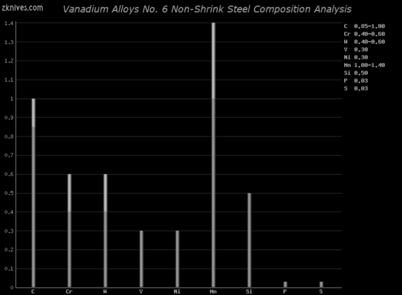 No. 6 Non-Shrink(Vanadium Alloys) - 流行的锻造钢。被许多定制制造商和大众制造商使用,包括 Randall。良好的边缘稳定性和耐磨性,不如 AISI A2 或其同等产品坚韧,但在该部门仍然相当好。可以达到 65HRC,并且作为轻型/中型铣刀与精加工刃配合得很好。Randal 在 56HRC 左右使用它,其他制造商在 56-58HRC 左右使用它来制造较大的刀具,以及高于该比例的中/小型刀具。如果您正在寻找一把硬用刀,坩埚 CPM 3V、AISI L6 或 AISI A2 及其同类产品都是更好的选择。对于小刀,它在高硬度下绝对表现更好。